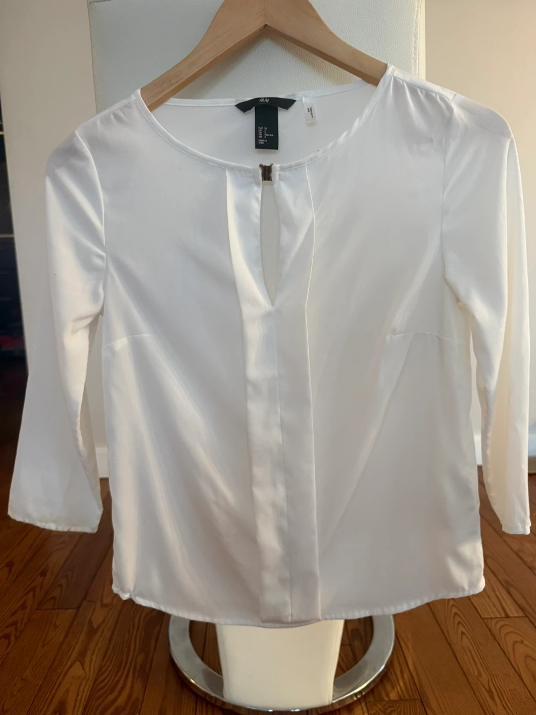 This is an H&M white blouse. It features a keyhole neckline and bell sleeves. The material feels smooth and has a slight sheen. It's a versatile piece that can be dressed up or down.
