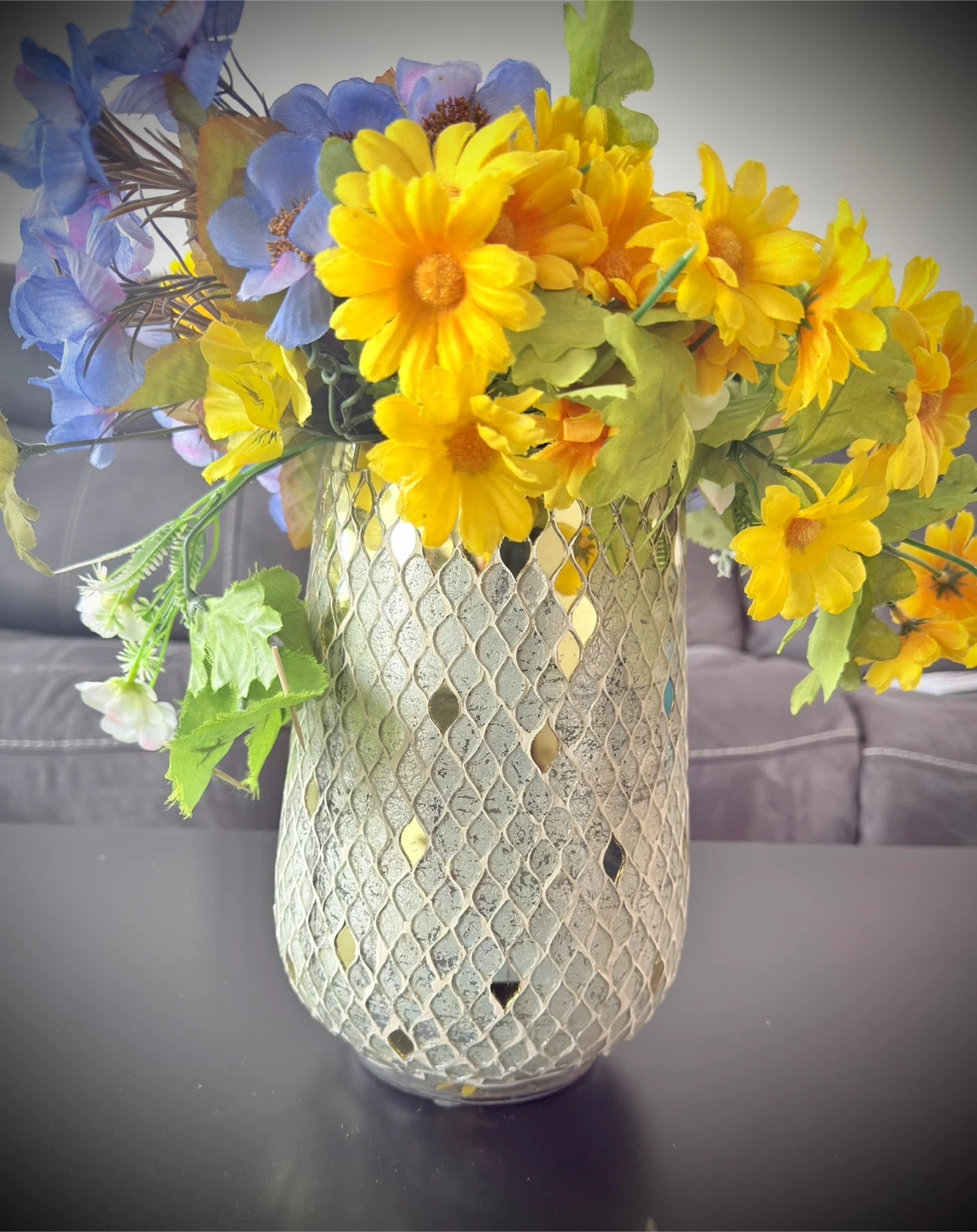 This is a decorative mosaic glass vase. It's embellished with a textured diamond pattern. The vase comes with a colourful arrangement of faux flowers, including yellow daisies and blue blossoms.