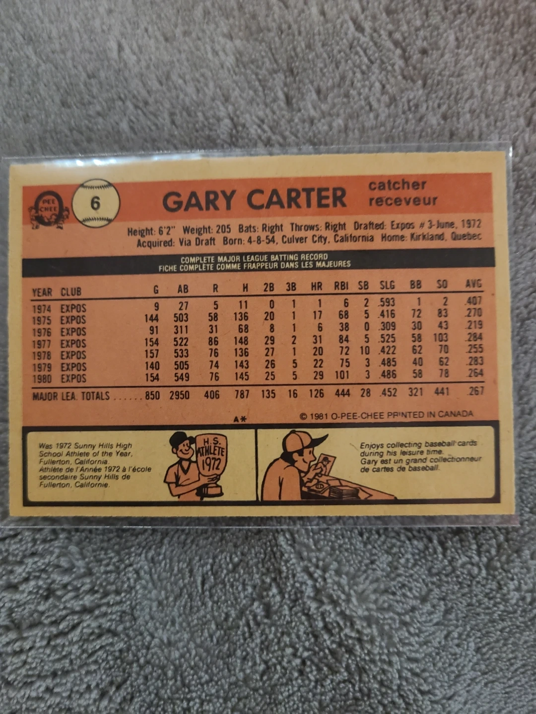 This is a 1981 O-Pee-Chee baseball card featuring Gary Carter. It's printed in Canada. The card includes his complete major league batting record.