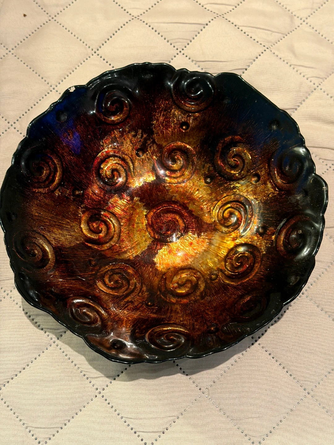 This decorative glass bowl features a unique swirl pattern in warm metallic tones of copper, gold, and deep blue. Its ruffled edge adds a touch of elegance. It's a lovely piece for display or holding small items.