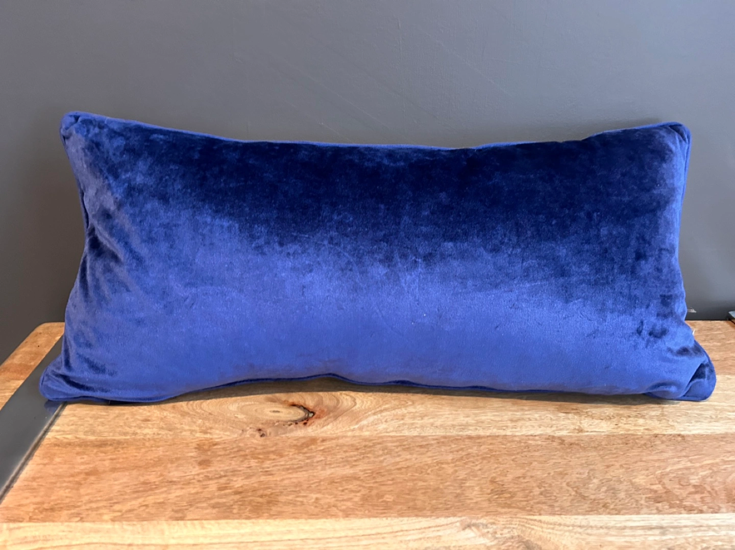 Rectangular lumbar pillow. One side features a cactus print, the other is solid navy blue velvet. Soft and plush. Perfect for adding a pop of colour to your living space.
