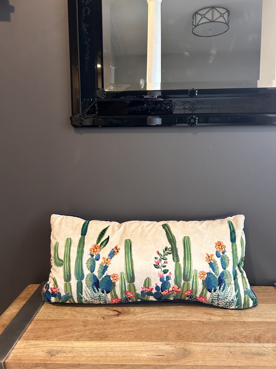 Rectangular lumbar pillow. One side features a cactus print, the other is solid navy blue velvet. Soft and plush. Perfect for adding a pop of colour to your living space.