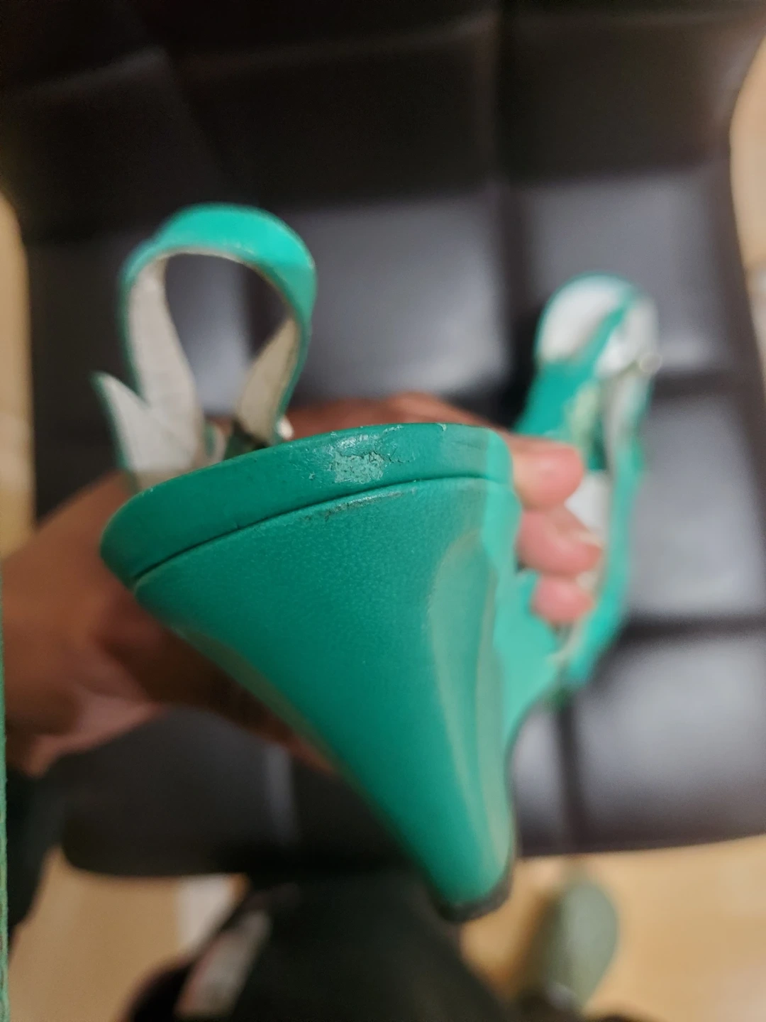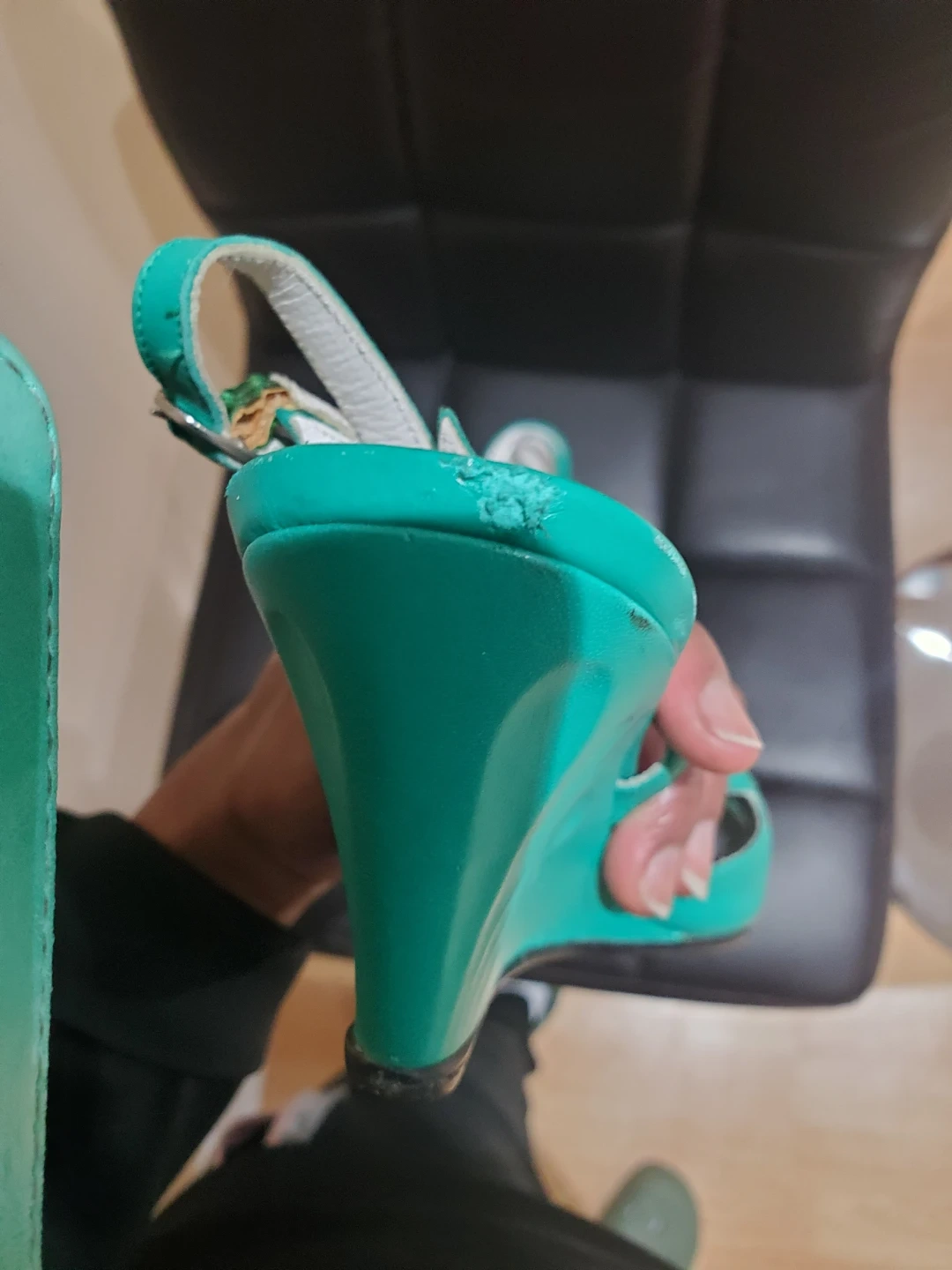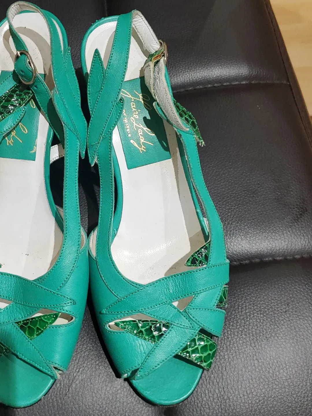 Fair Lady Paris teal wedge heels with faux croc detailing. These open-toe slingbacks have an adjustable ankle strap. Some scuffing on the heels, as shown.
