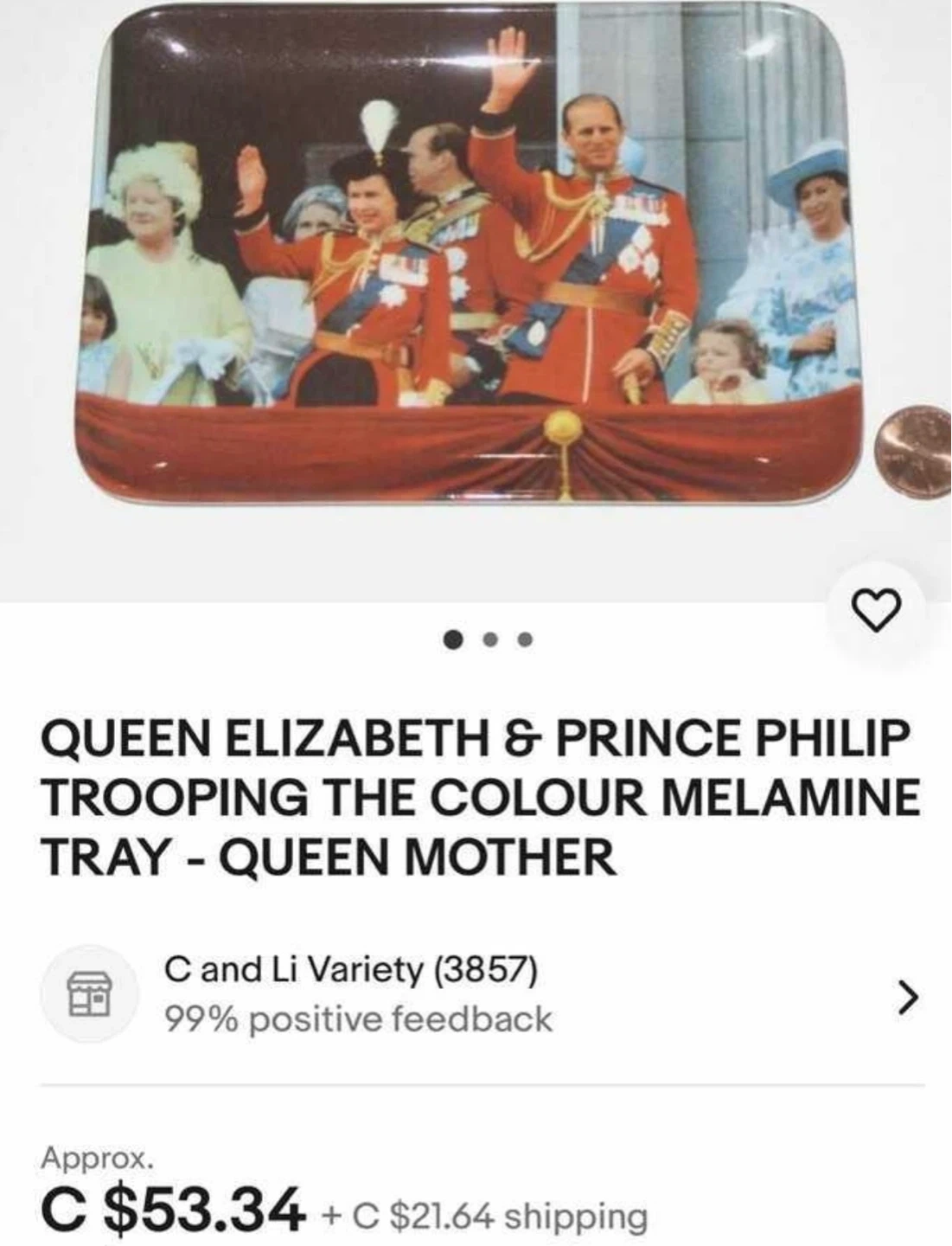 $24 Vintage Queen Elizabeth & Prince Philip Trooping the colour melamine mini souvenir tray.