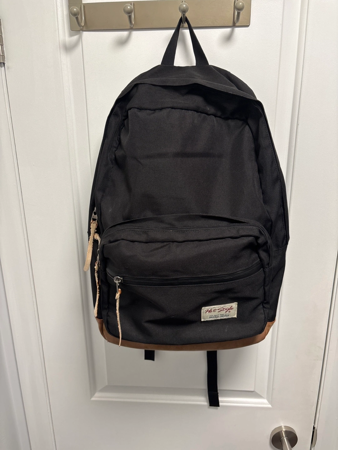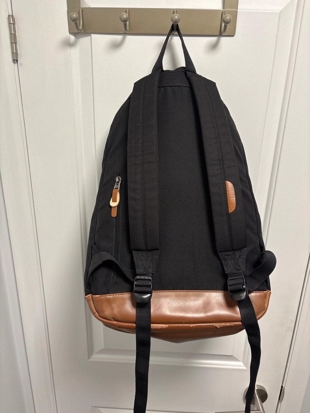 Large black backpack. Features brown leather accents. Multiple zippered compartments. Mesh bottle pockets inside Adjustable shoulder straps. Some wear and tear on leather zipper pulls.