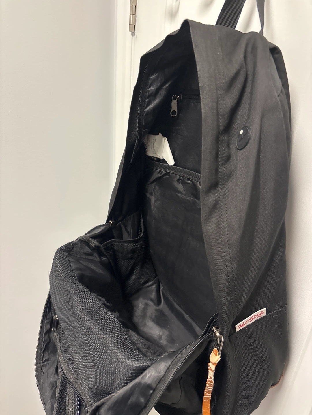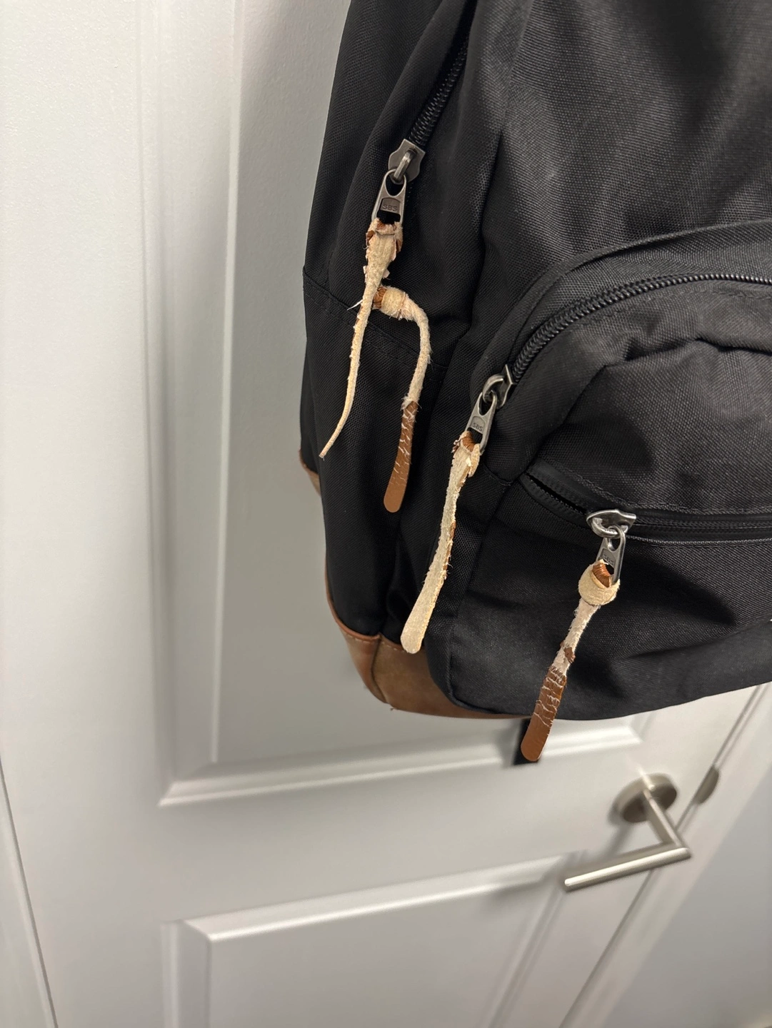 Large black backpack. Features brown leather accents. Multiple zippered compartments. Mesh bottle pockets inside Adjustable shoulder straps. Some wear and tear on leather zipper pulls.