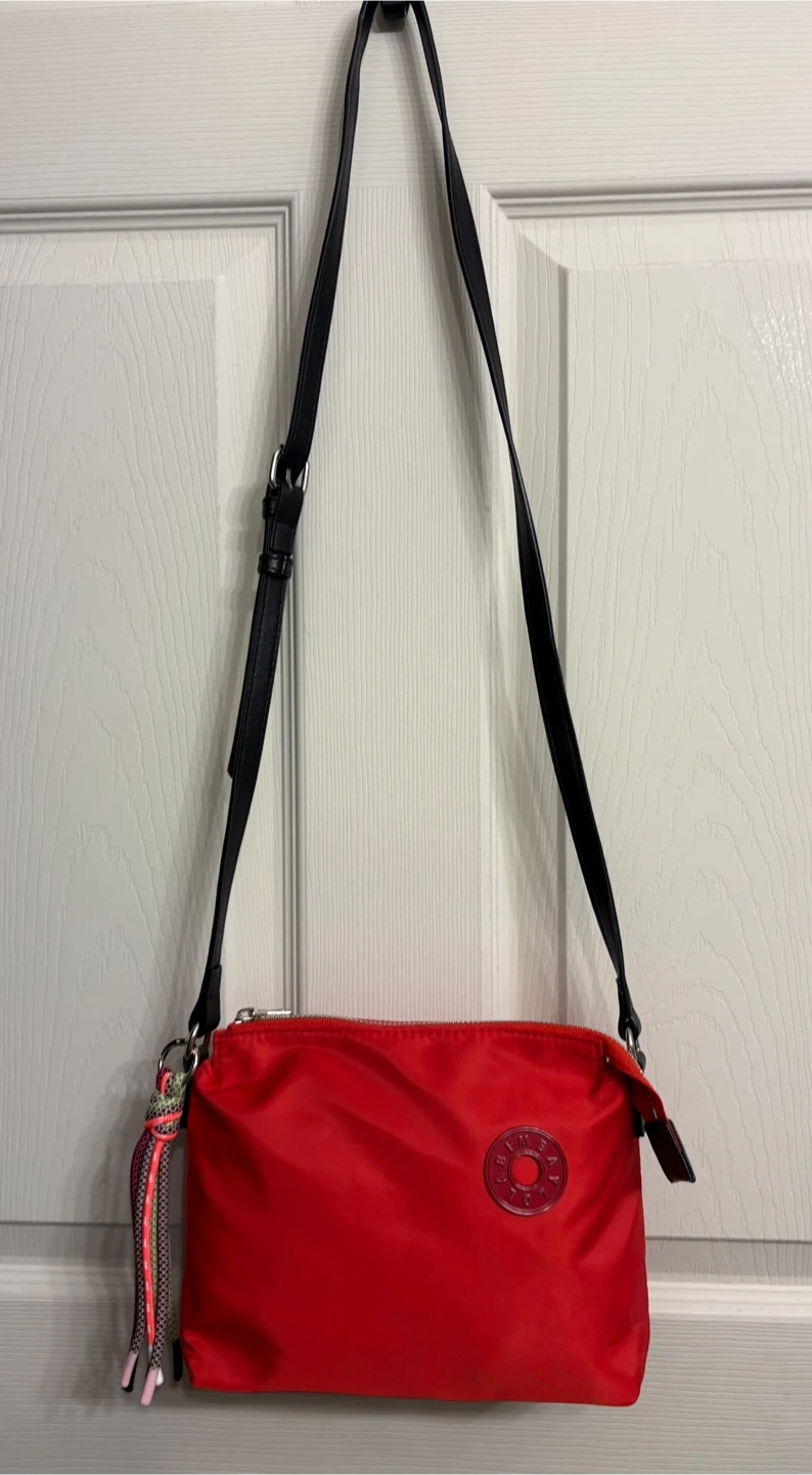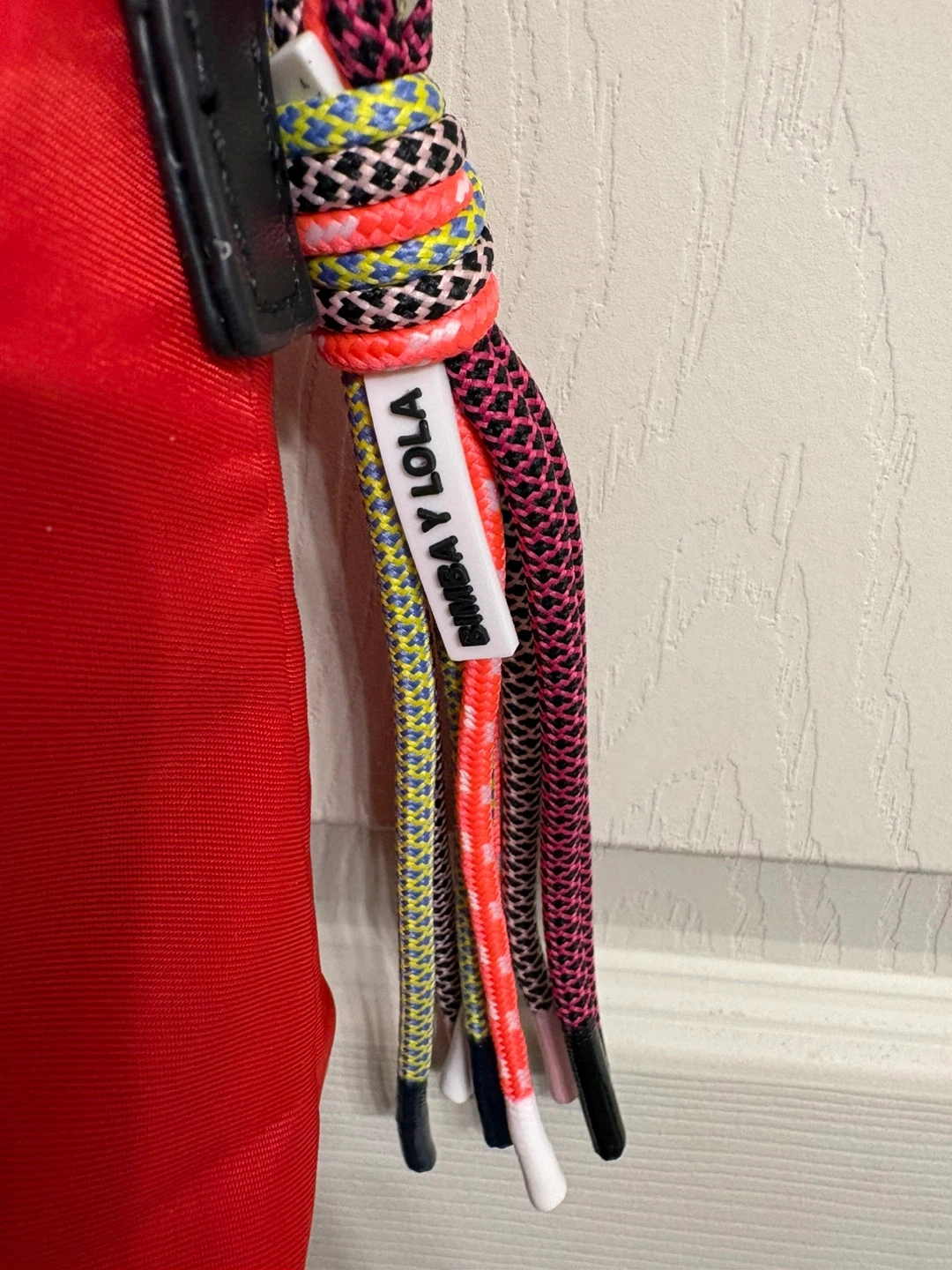 Bright red nylon crossbody bag from Bimba y Lola. It has a zip closure and an adjustable strap. Includes a colourful rope tassel detail.