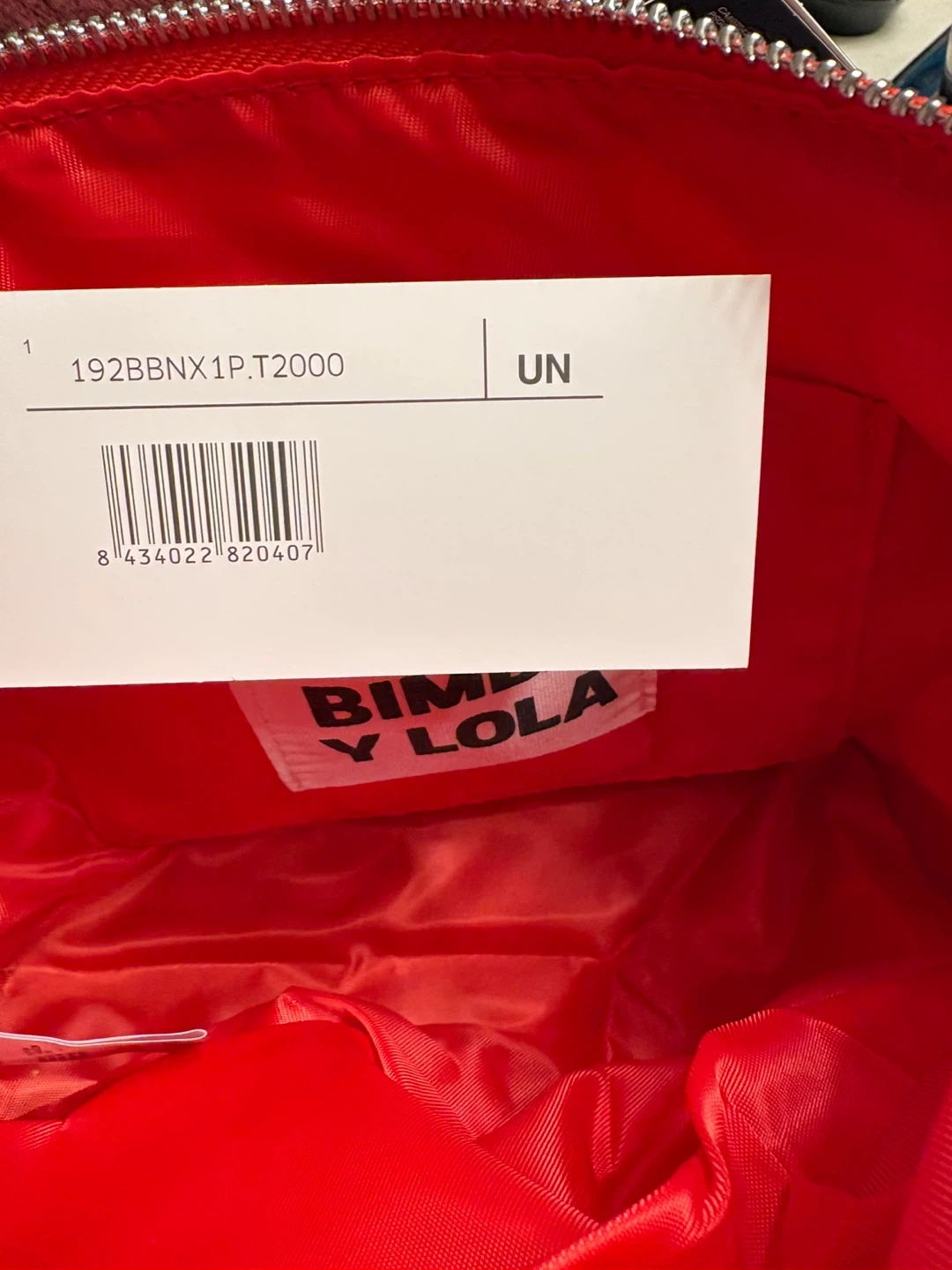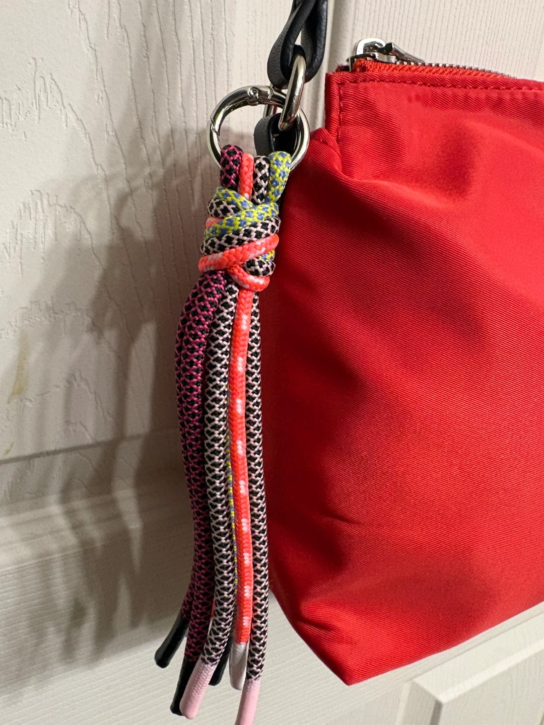 Bright red nylon crossbody bag from Bimba y Lola. It has a zip closure and an adjustable strap. Includes a colourful rope tassel detail.
