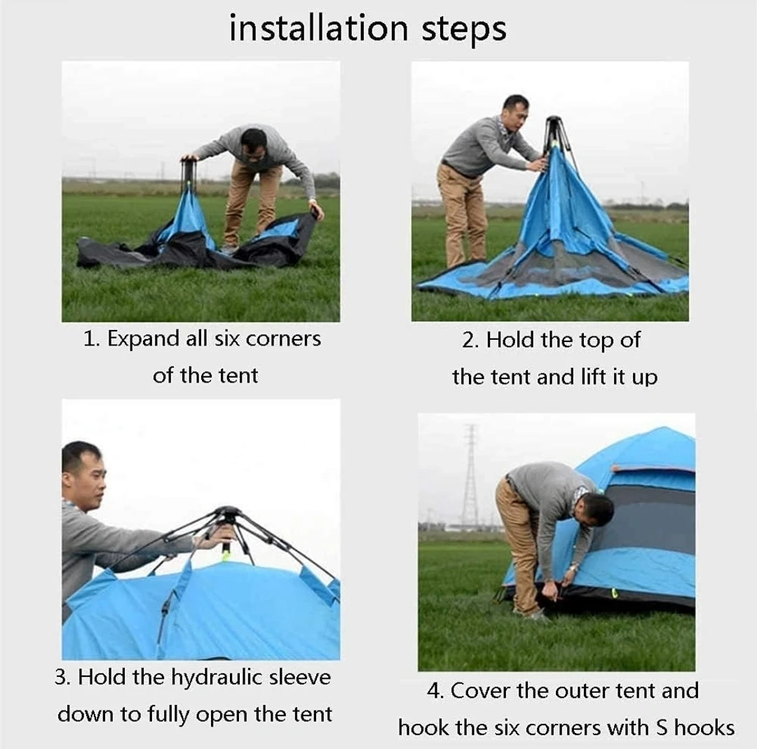 This is a blue pop-up tent with external dimensions of 240x240x135cm and internal dimensions of 220x220x130cm. It's easy to set up and take down,in the minutes.