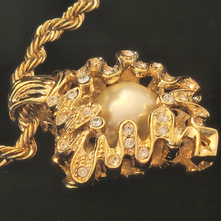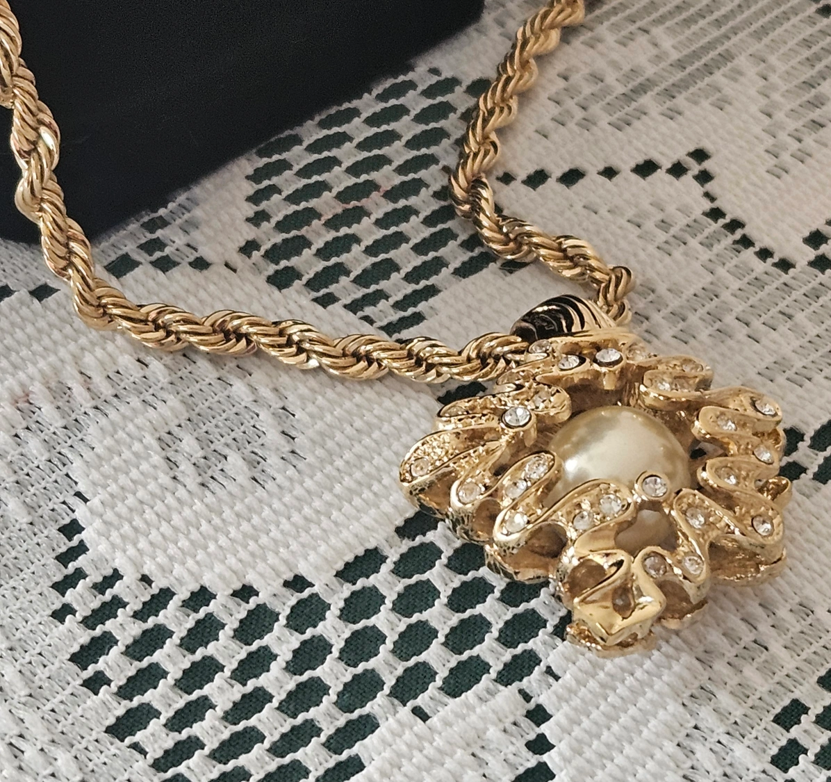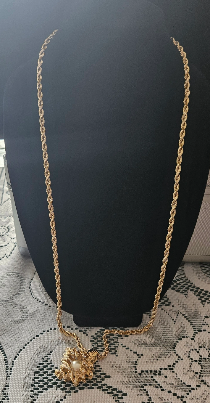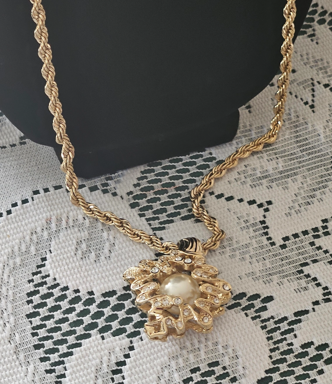 The Fifth Avenue Collection is known for beautiful high end handcrafted fashion jewelry and this eye-catching large cream/beige faux pearl necklace pendant accented with small round clear gemstones on a Gold Tone Rope Chain Necklace is a beautiful example of Fifth Avenue Collection quality craftsmanship