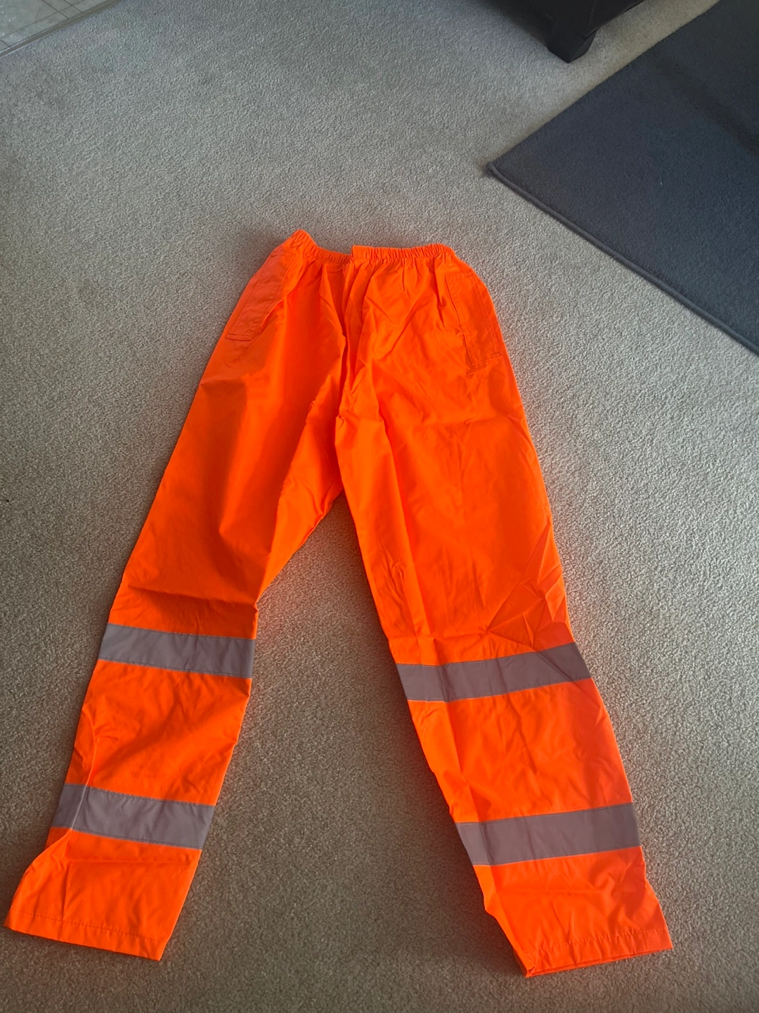Bright orange CSA approved pants. Size XL. Elastic waistband. Reflective strips. Two pockets. New with tags.