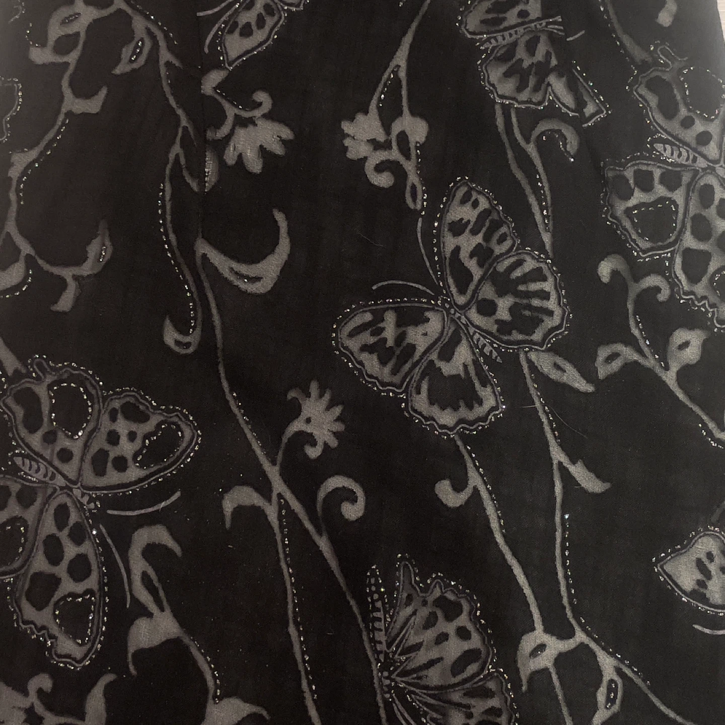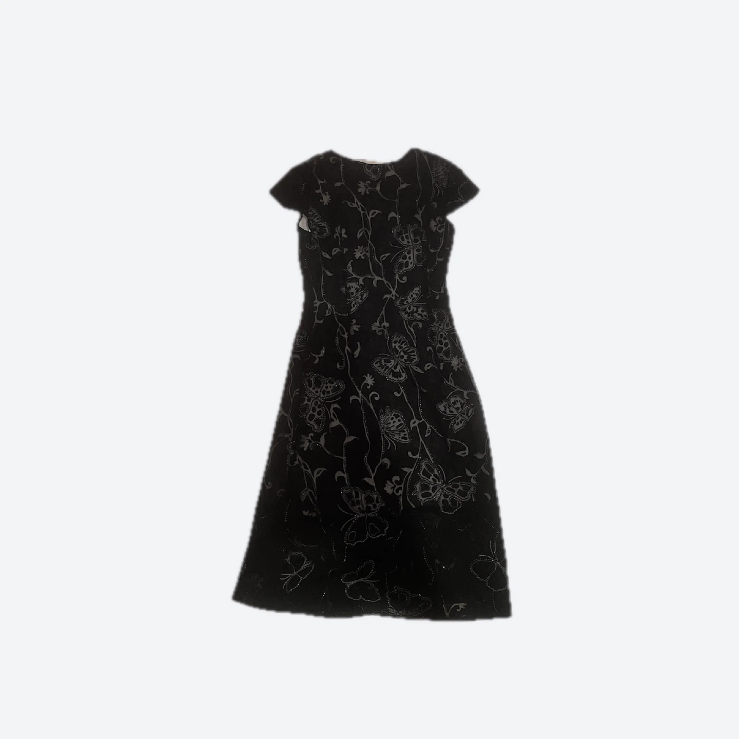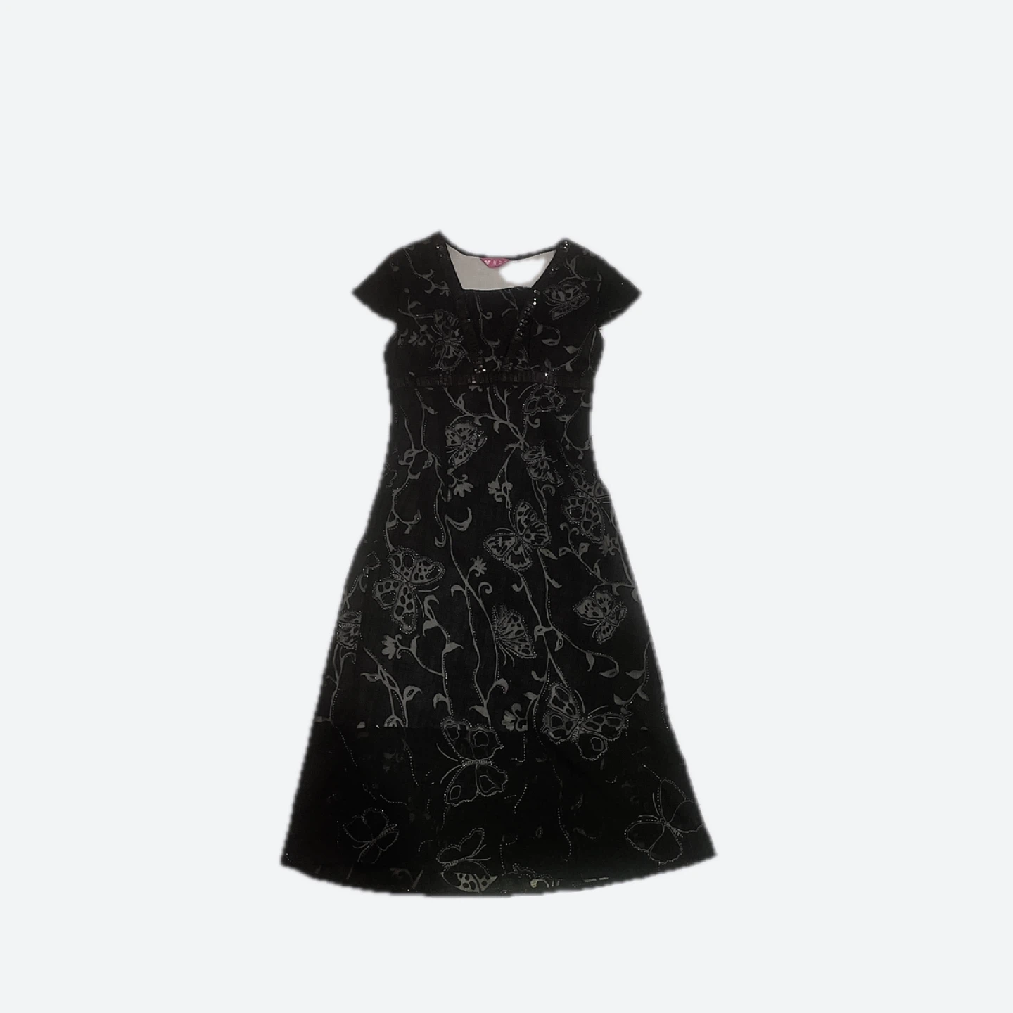 Black Y2K Vintage short-sleeved dress with a grey butterfly and floral print. It features sequin detailing along the neckline and waist. Made from a lightweight fabric.