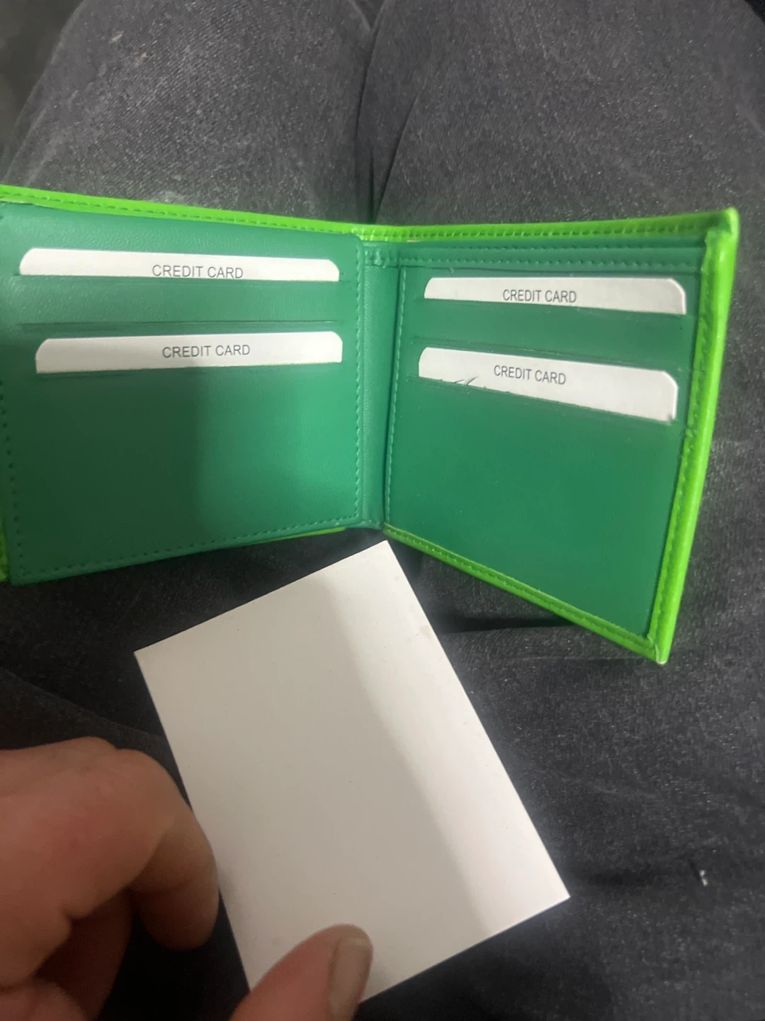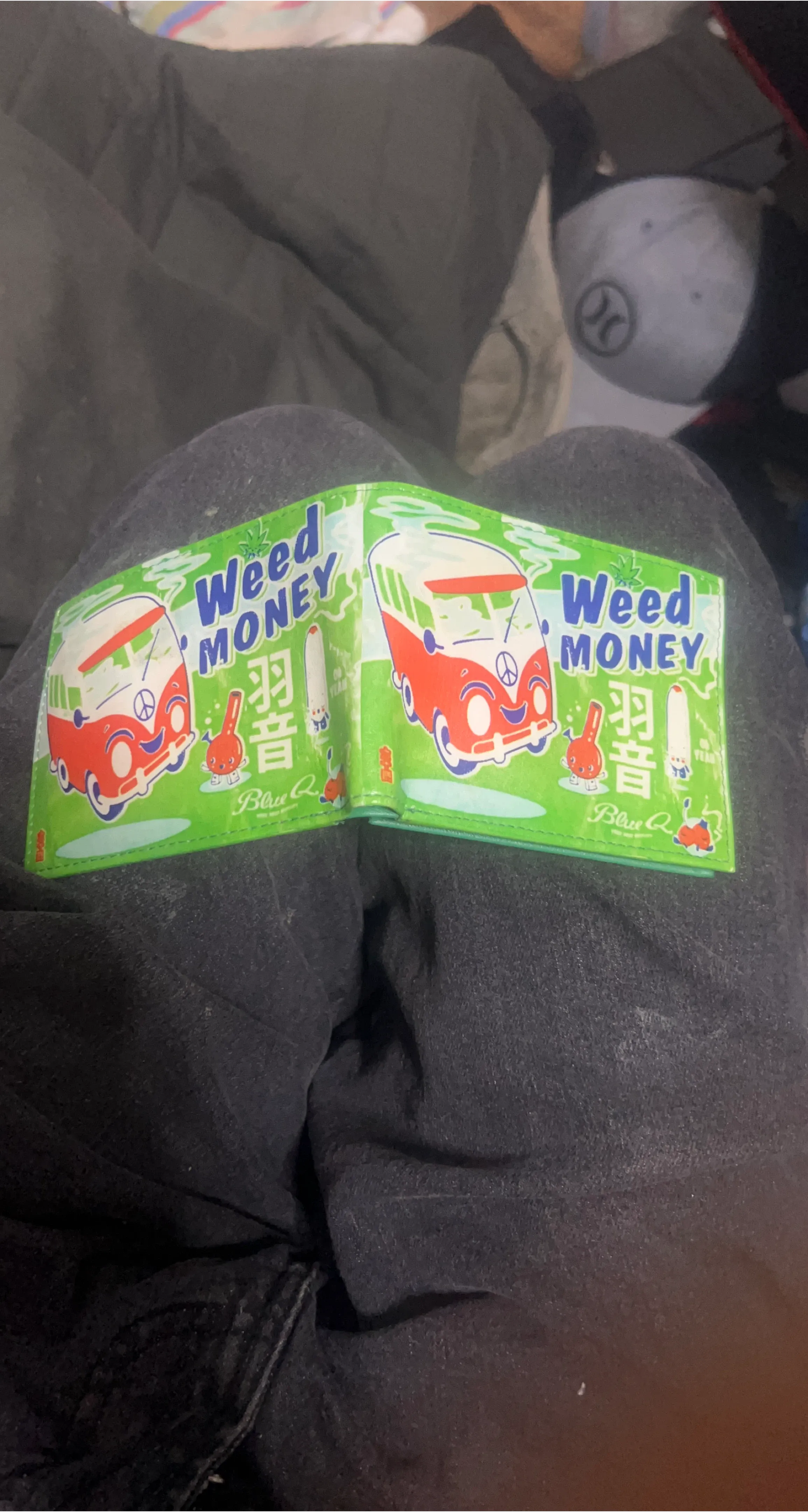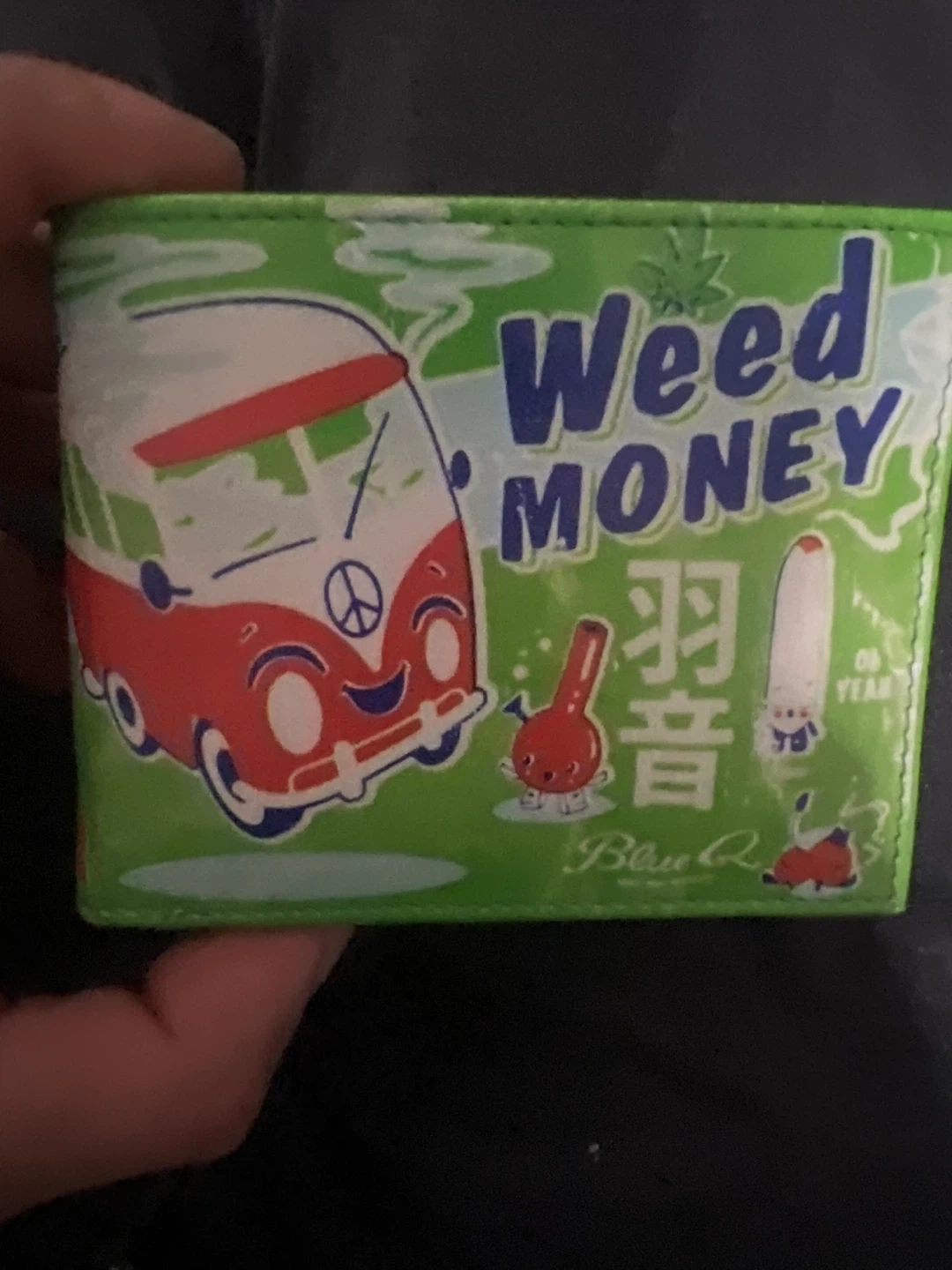 This Blue Q wallet features a fun "Weed Money" design with a VW bus graphic. It opens up to reveal multiple card slots. It's a compact and stylish way to carry your essentials!