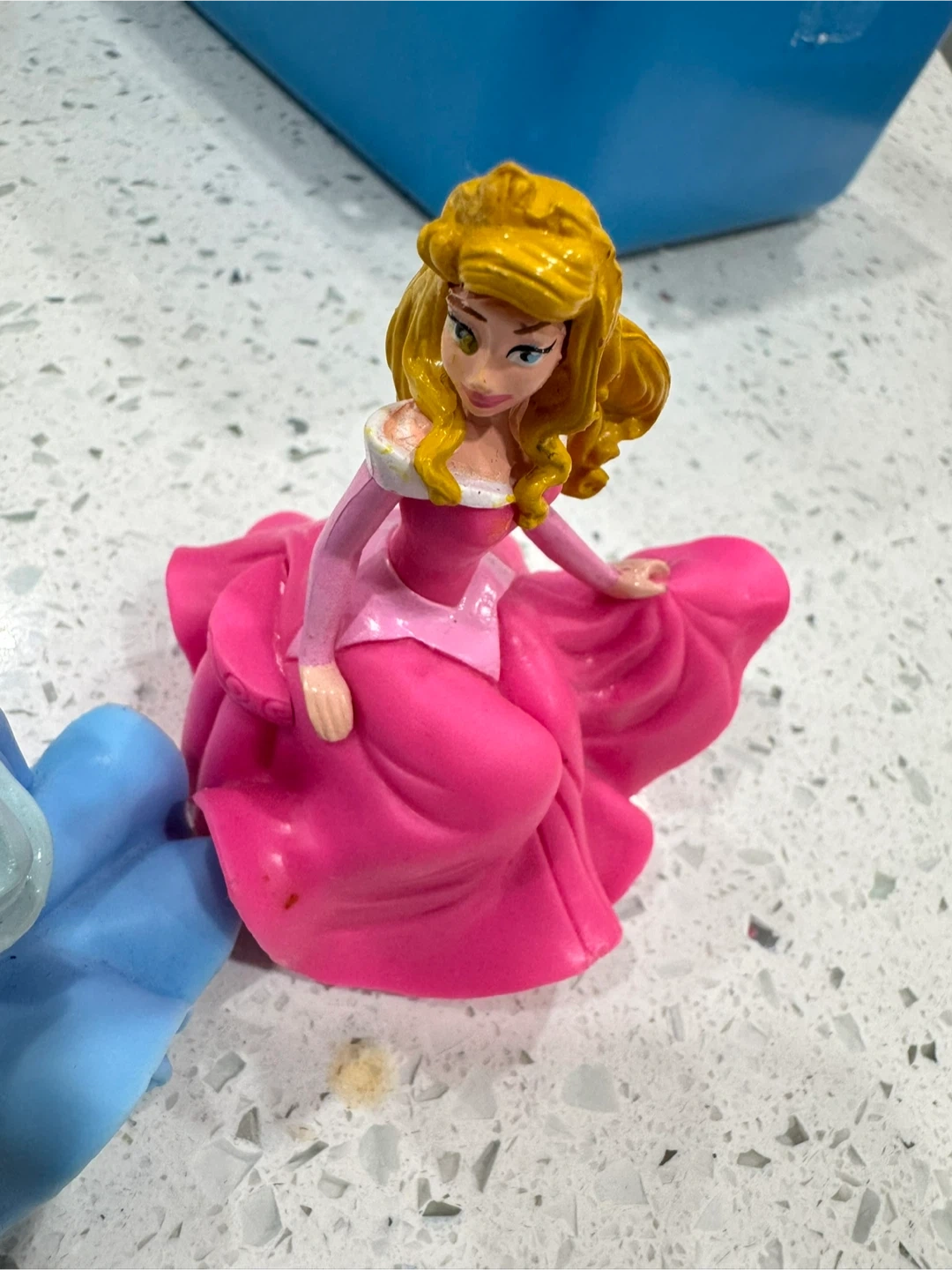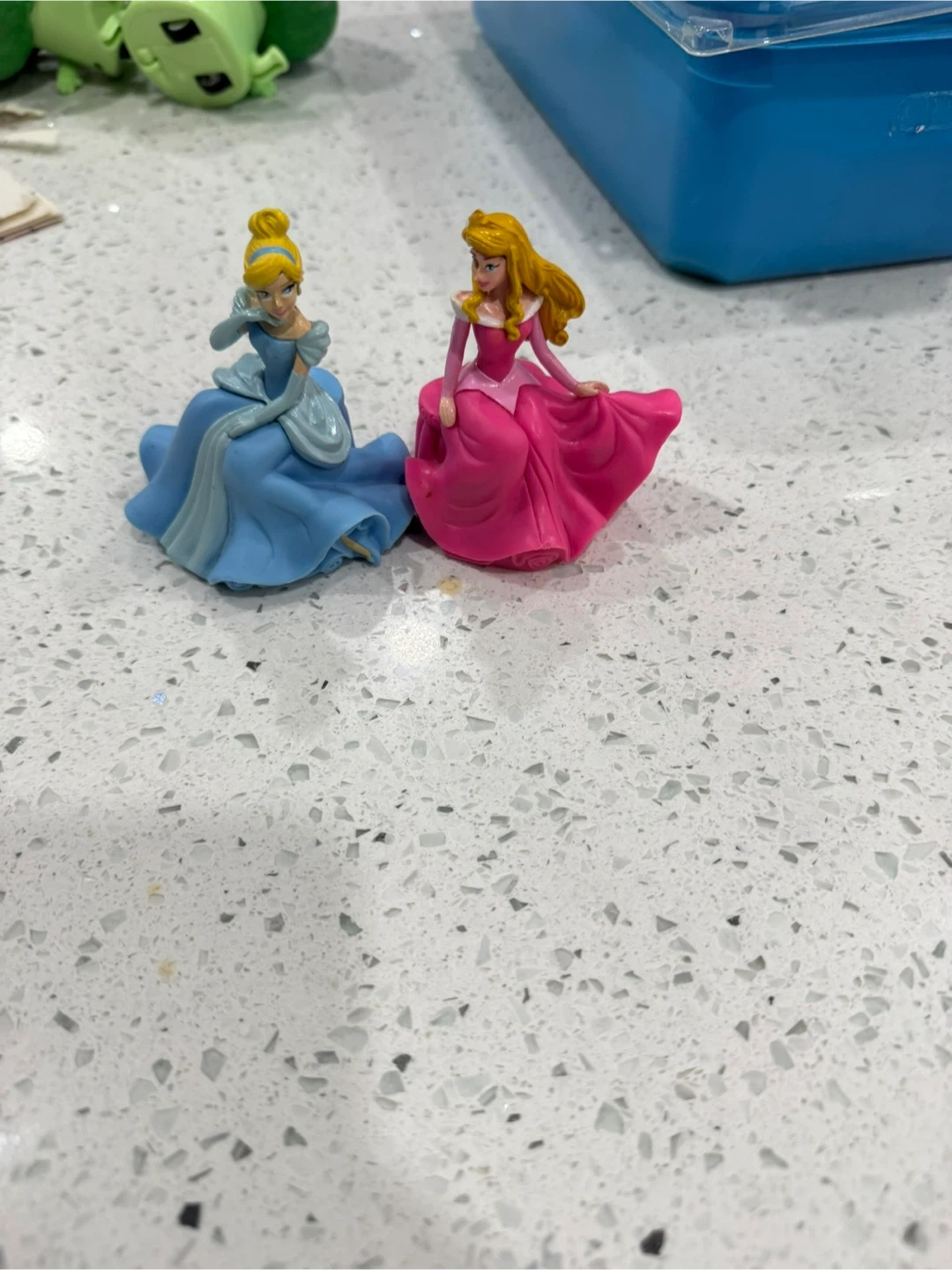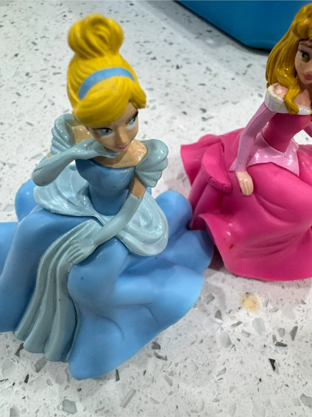 Two Disney Princess figurines featuring Cinderella in blue and Aurora in pink. These plastic figures are perfect for any fan's collection. They're great for imaginative play or display!