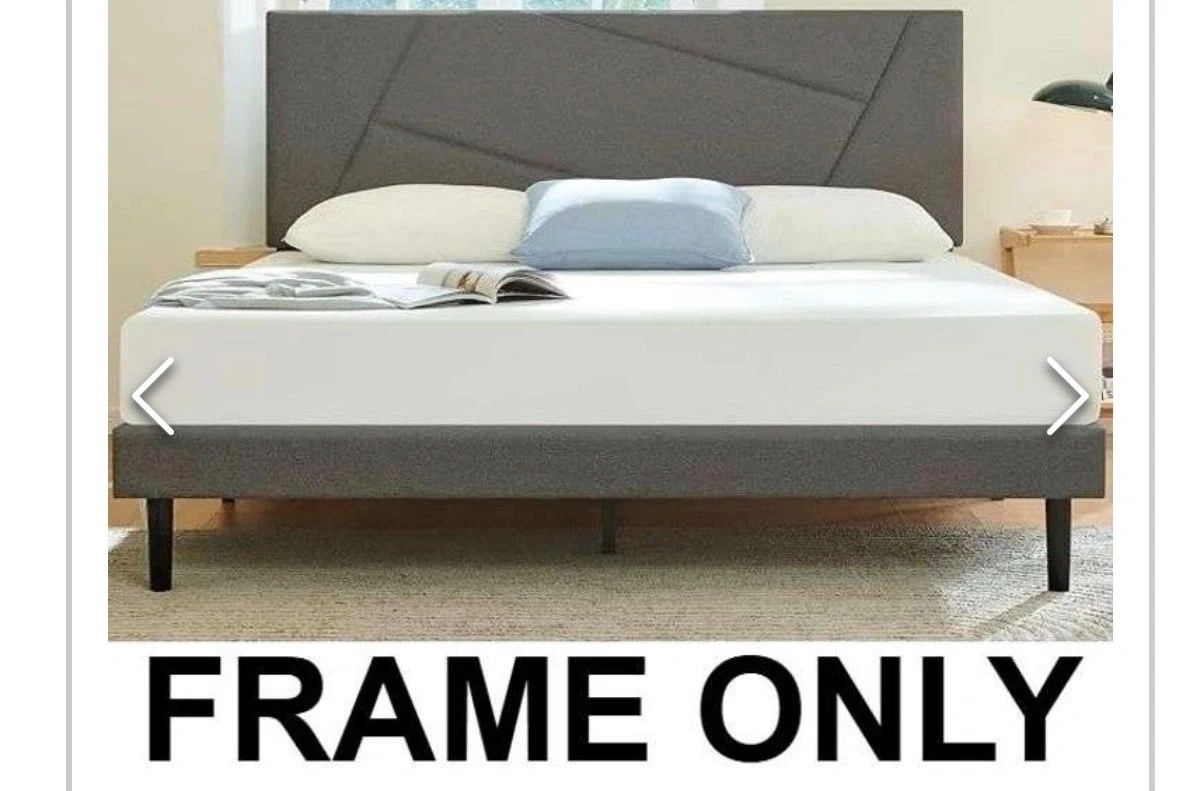 This is a grey fabric queen size bed frame, including a stylish upholstered headboard. It's easy to assemble and provides sturdy support for your mattress. The modern design fits well in most bedrooms.