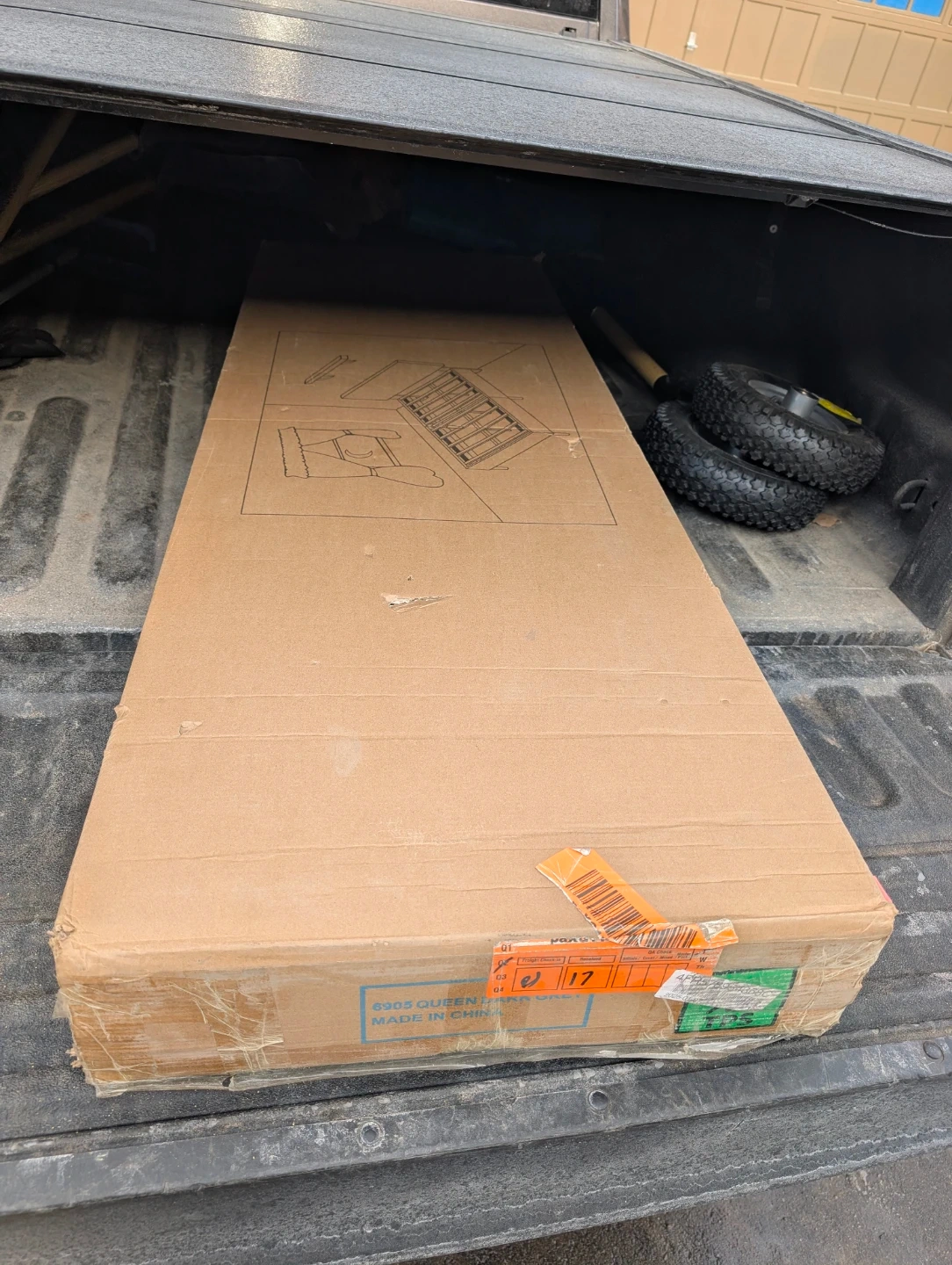 This is a grey fabric queen size bed frame, including a stylish upholstered headboard. It's easy to assemble and provides sturdy support for your mattress. The modern design fits well in most bedrooms.