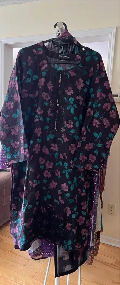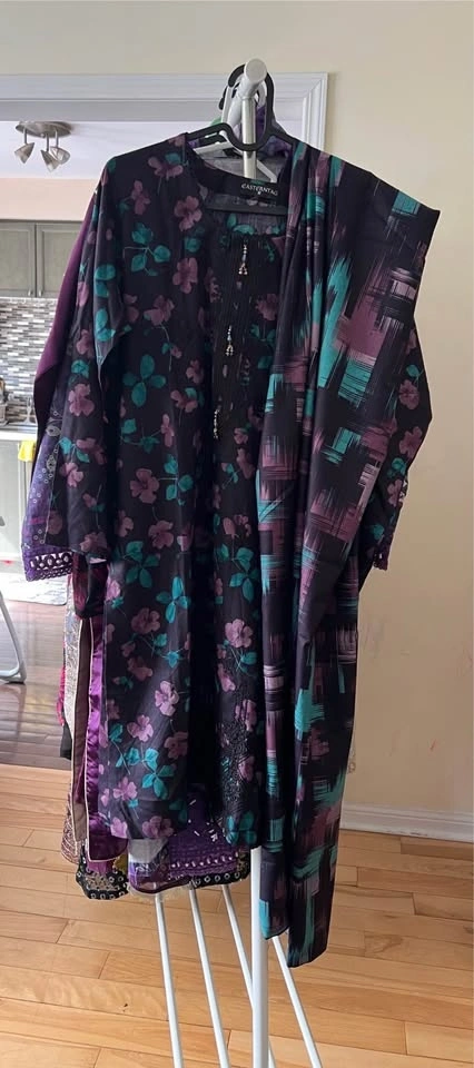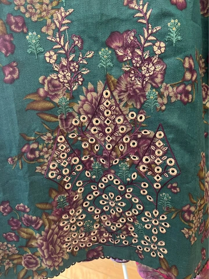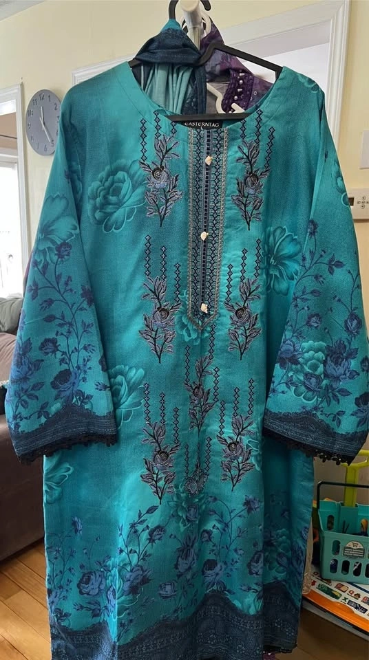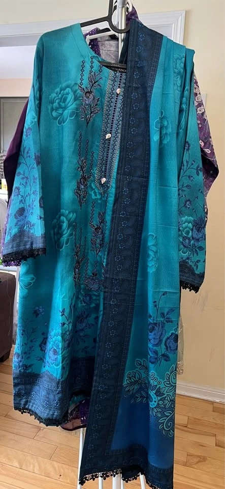 Beautiful 3pcs embroidered and laced suits in vibrant colors and soft linen Dhanak fabric, perfect for any season. Sizes Medium to Large. Check my other listings too.