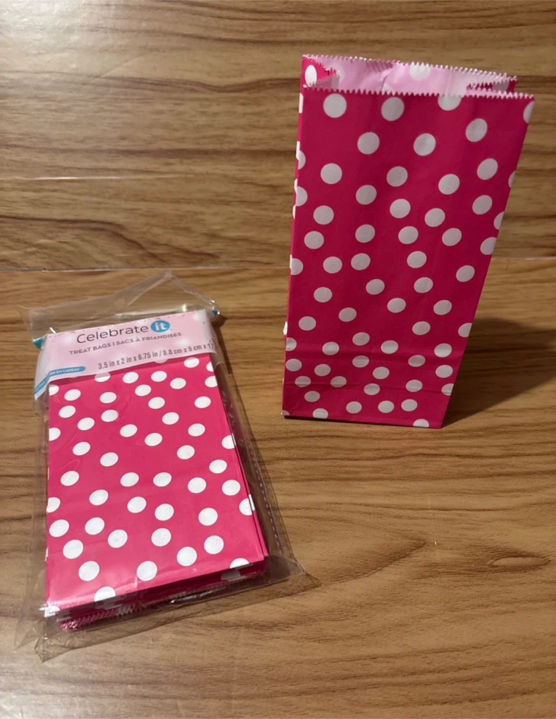 These Celebrate It treat bags are perfect for parties and gifts; they measure 3.5 inches by 2 inches by 6.75 inches. They come in a vibrant pink with white polka dots and one package is sealed, containing 15 bags new. Missing one. Add a pop of fun to your next celebration!