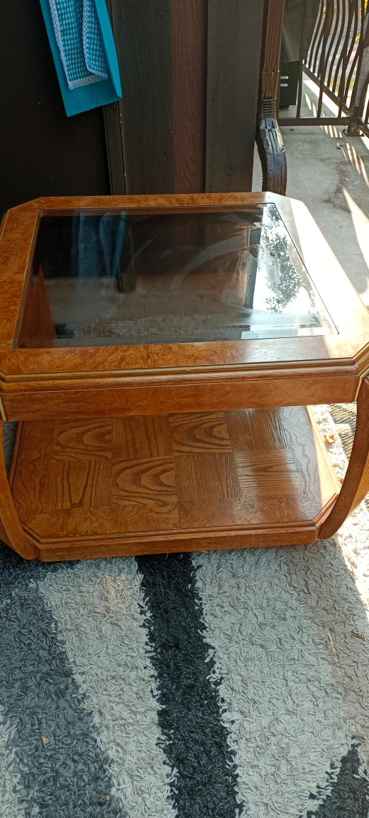 Selling a coffee table with a wood frame and glass top. It has a unique wood grain pattern and a lower shelf for storage. Perfect for a living room or den!