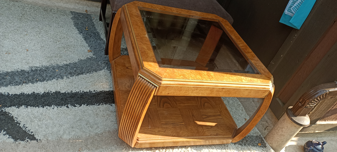 Selling a coffee table with a wood frame and glass top. It has a unique wood grain pattern and a lower shelf for storage. Perfect for a living room or den!
