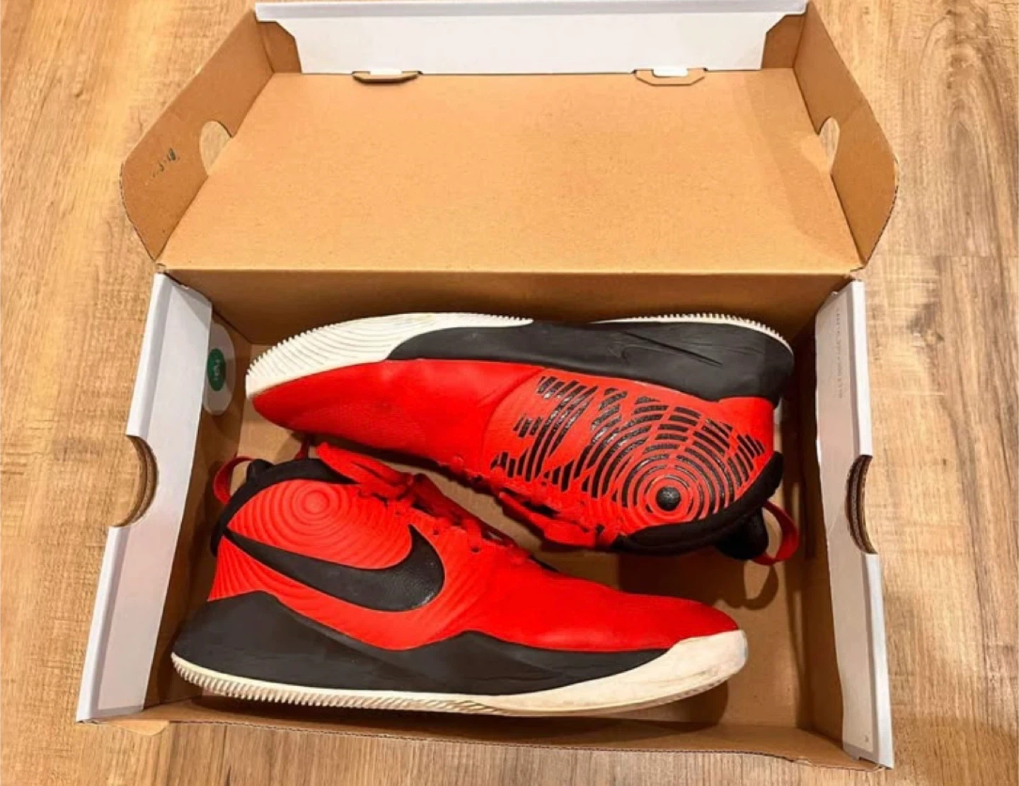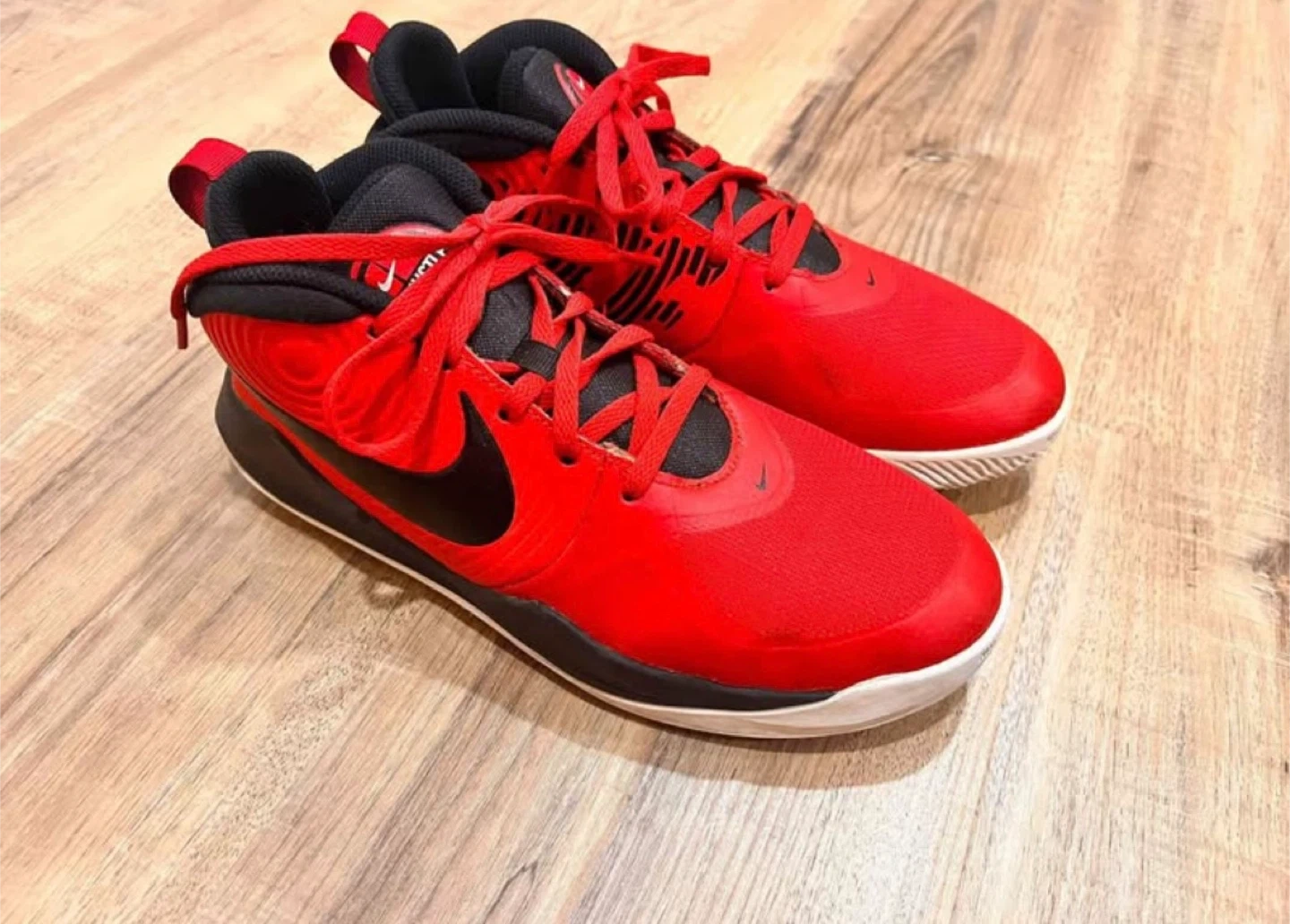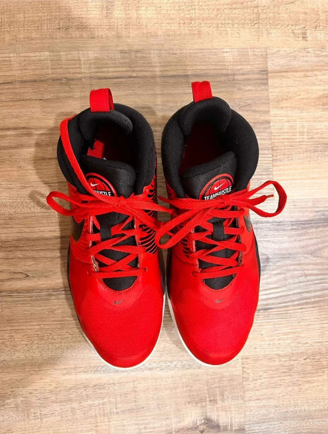 These are Nike Team Hustle D 9 basketball shoes in red and black. They're designed for young athletes.