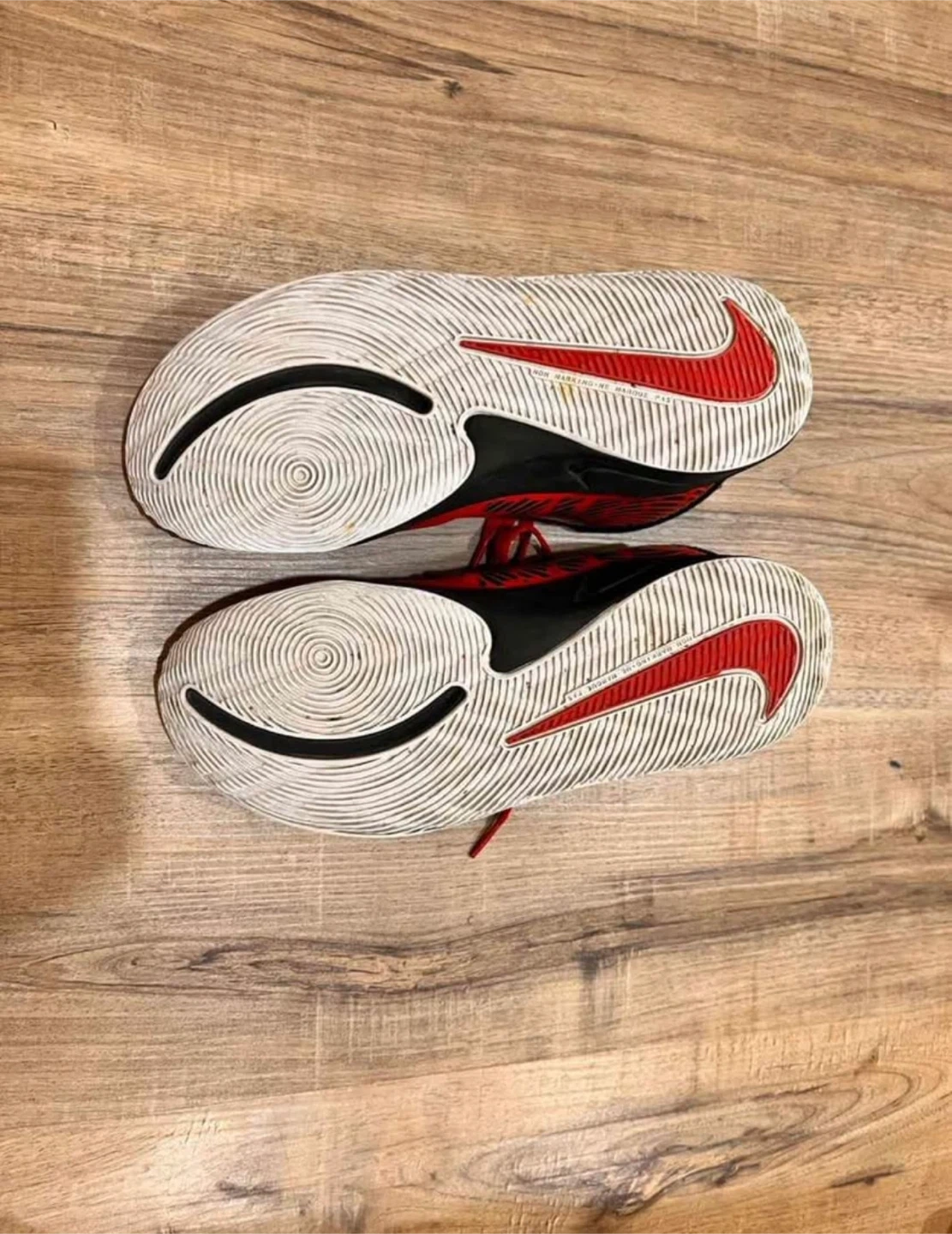 These are Nike Team Hustle D 9 basketball shoes in red and black. They're designed for young athletes.