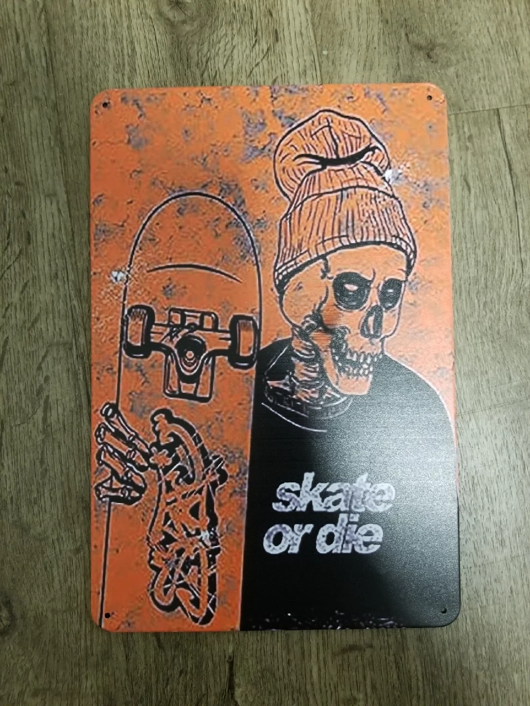 240Selling a metal sign with a cool design featuring a skeleton with a beanie and a skateboard. It says 'skate or die' on it. Great for adding some edge to your room or skate space! Brand new 8x12