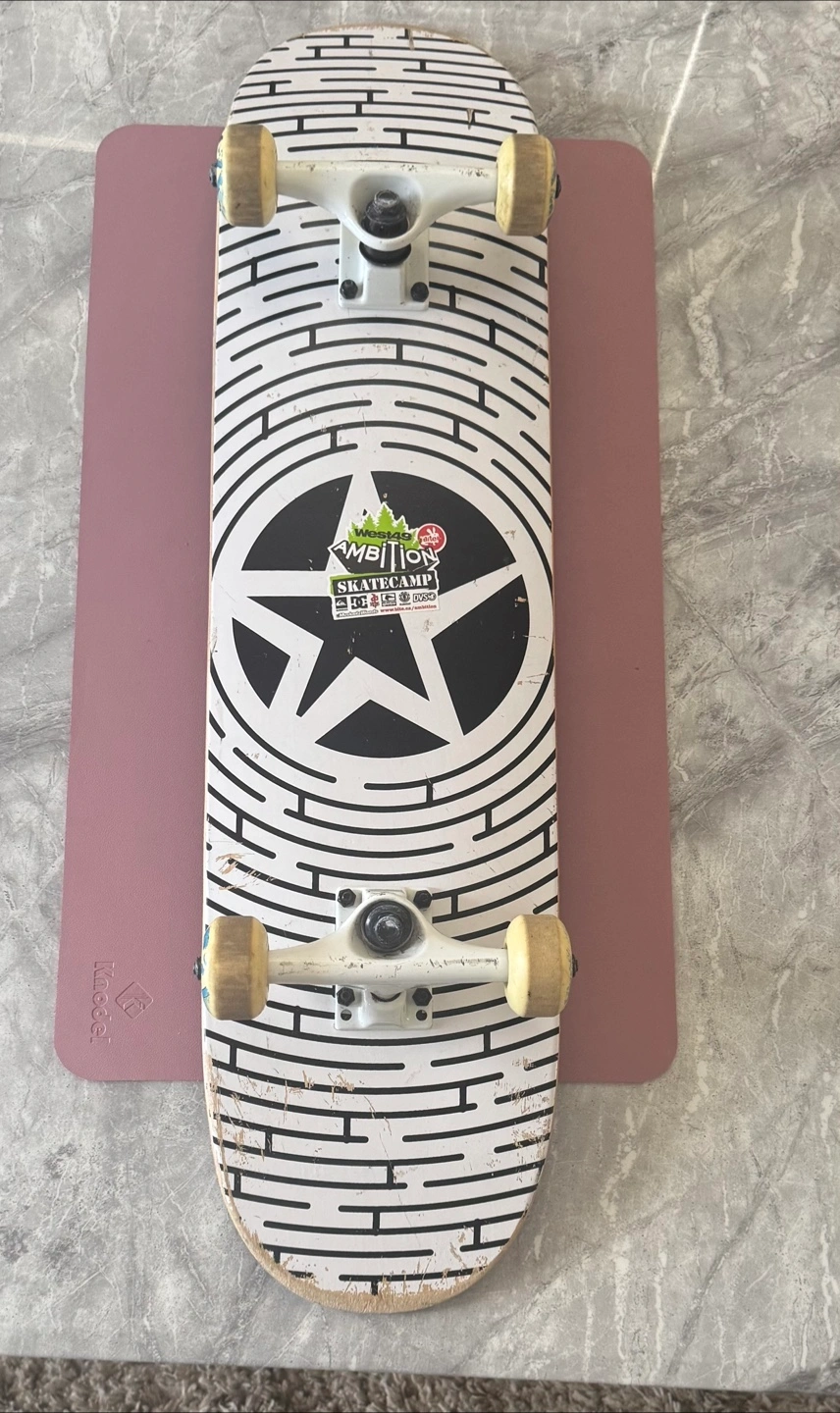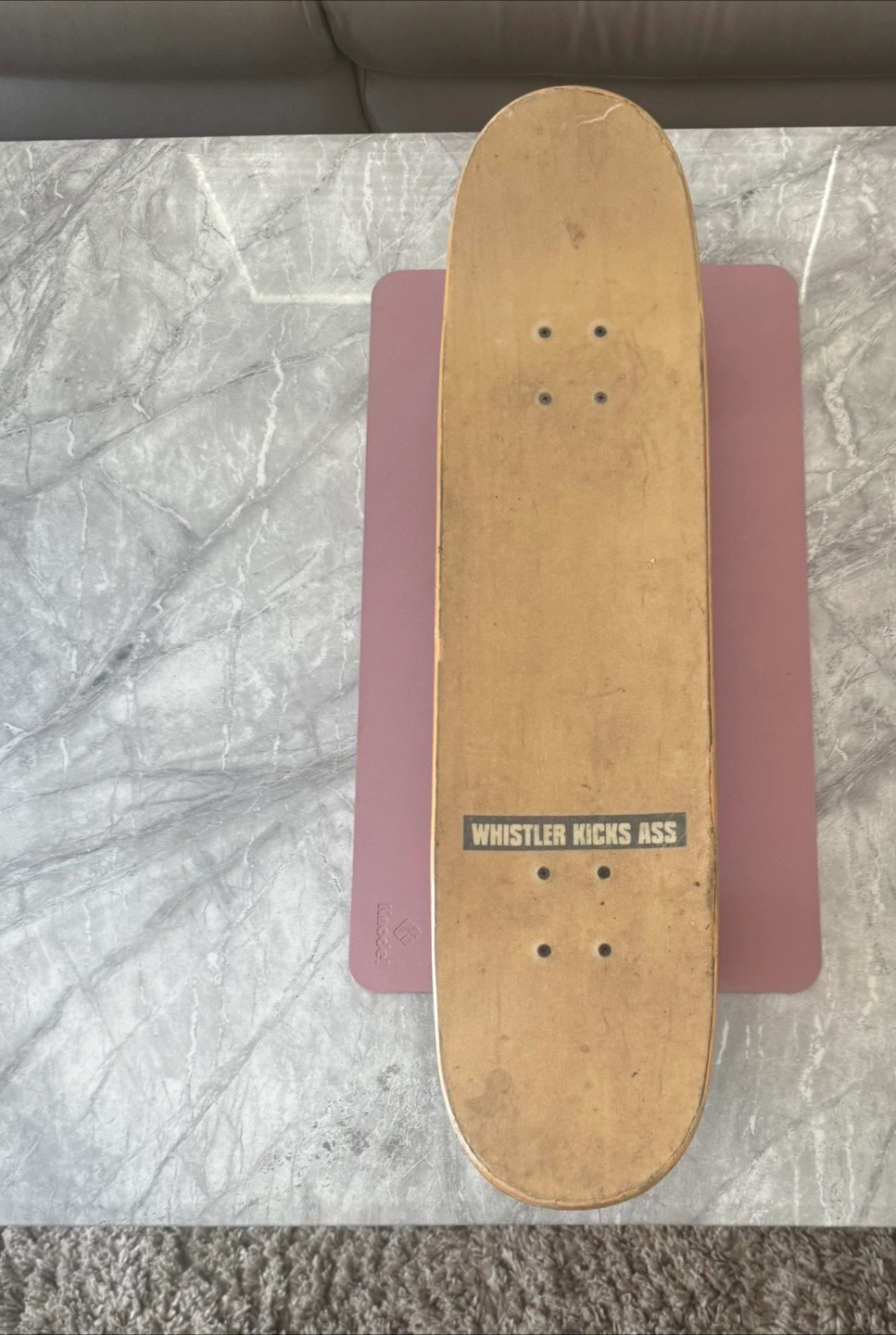 Selling a used skateboard. It has a unique design with the Ambition Skate Camp logo on the top and the phrase "Whistler Kicks Ass" on the bottom. It shows signs of wear, but is still functional