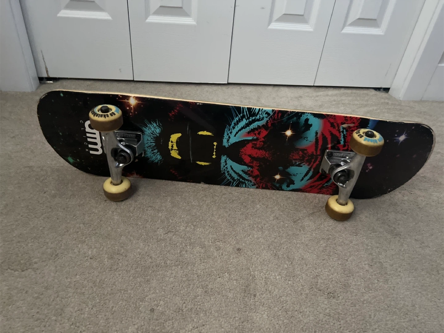 34Selling a skateboard! It features a cool design on the bottom. Perfect for anyone looking to cruise around town or hit the skatepark includes extra bearings