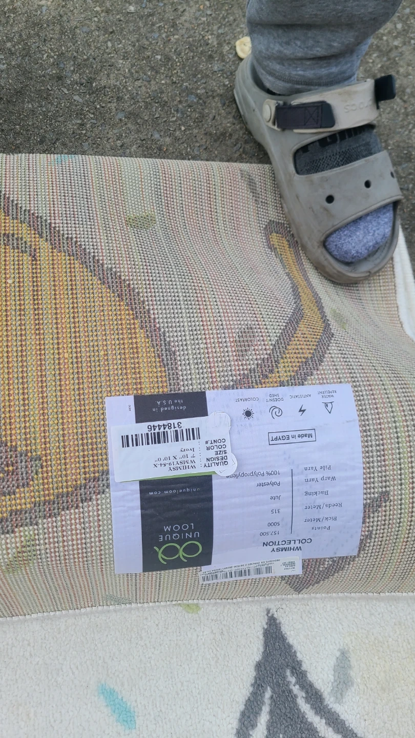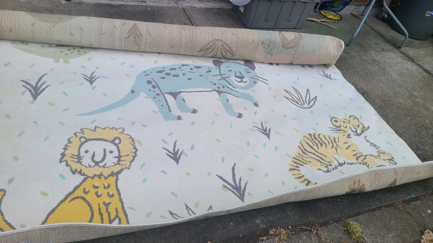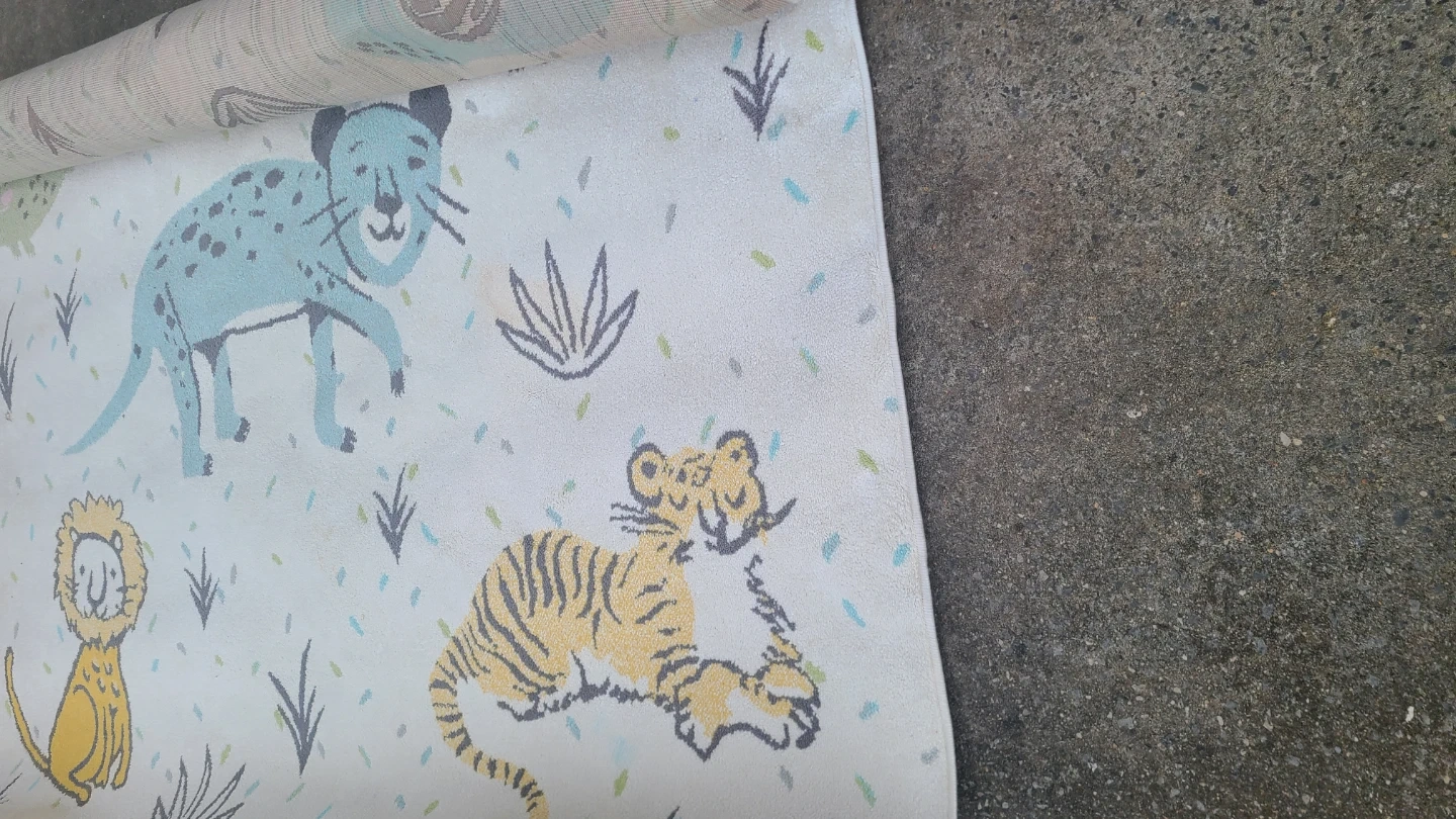This children's rug features a playful animal design with lions, tigers, and leopards. Made with 100% polypropylene and jute. It's soft, durable, and easy to clean. Measures 5' x 7'6".