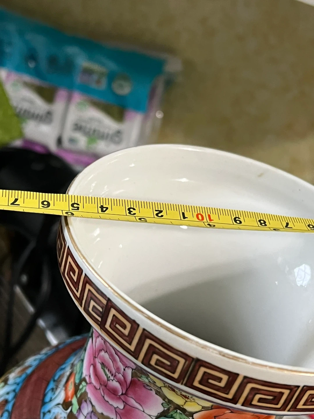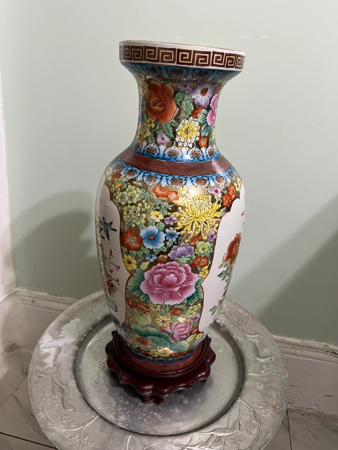 This is a beautiful ceramic vase with a vibrant floral and bird design. It features a colorful glaze and comes with a wooden base for display. Its decorative pattern makes it a striking piece for any room.