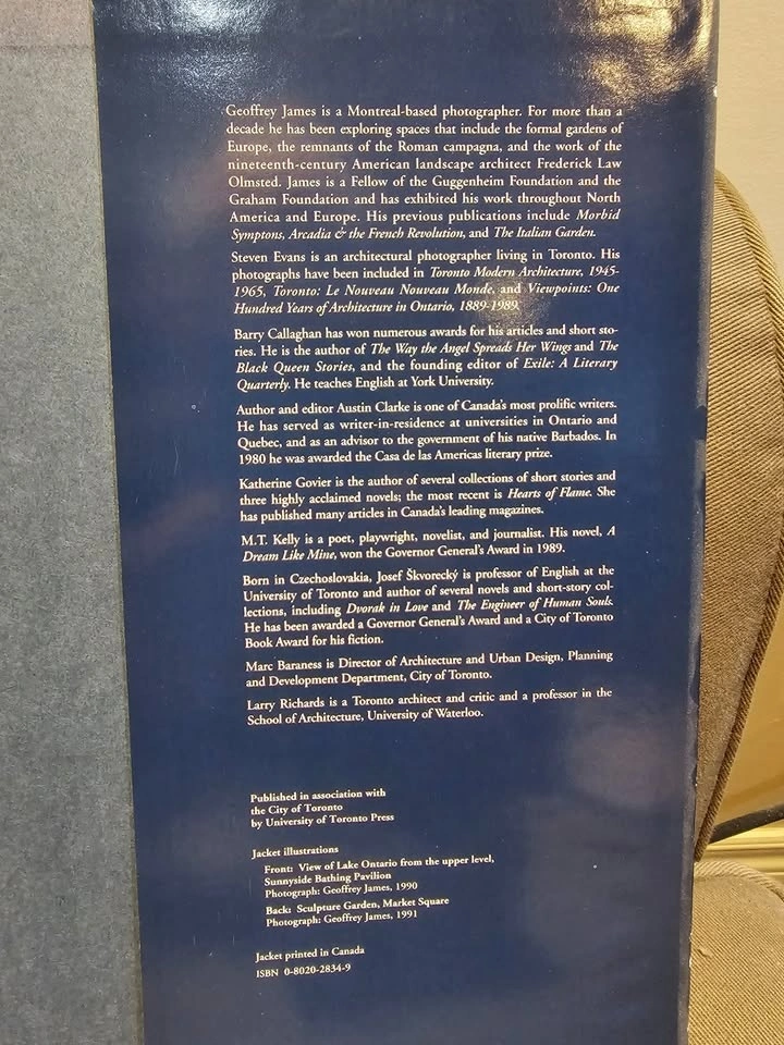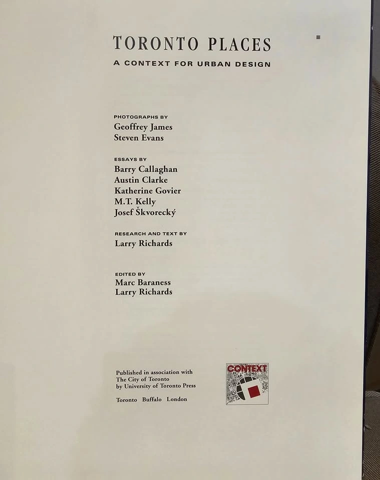 Hardcover copy of Toronto Places: A Context for Urban Design. Photographs by Geoffrey James and Steven Evans with essays by Barry Callaghan, Austin Clarke, Katherine Govier, M.T. Kelly, and Josef Skvorecky (Škvorecký). 107 pages, Hardcover. University of Toronto Press, 1992. ISBN 9780802028341. book, photography, coffee table book, ontario.