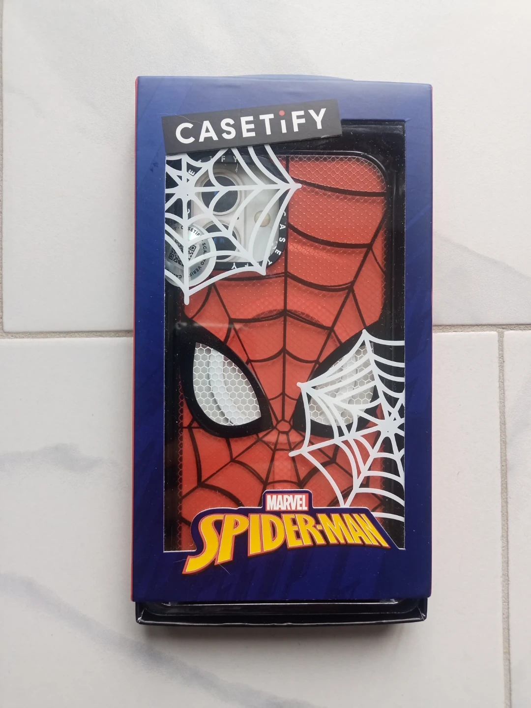 This is a Casetify brand iPhone case featuring Spider-Man. The case has a vibrant Spidey web design.