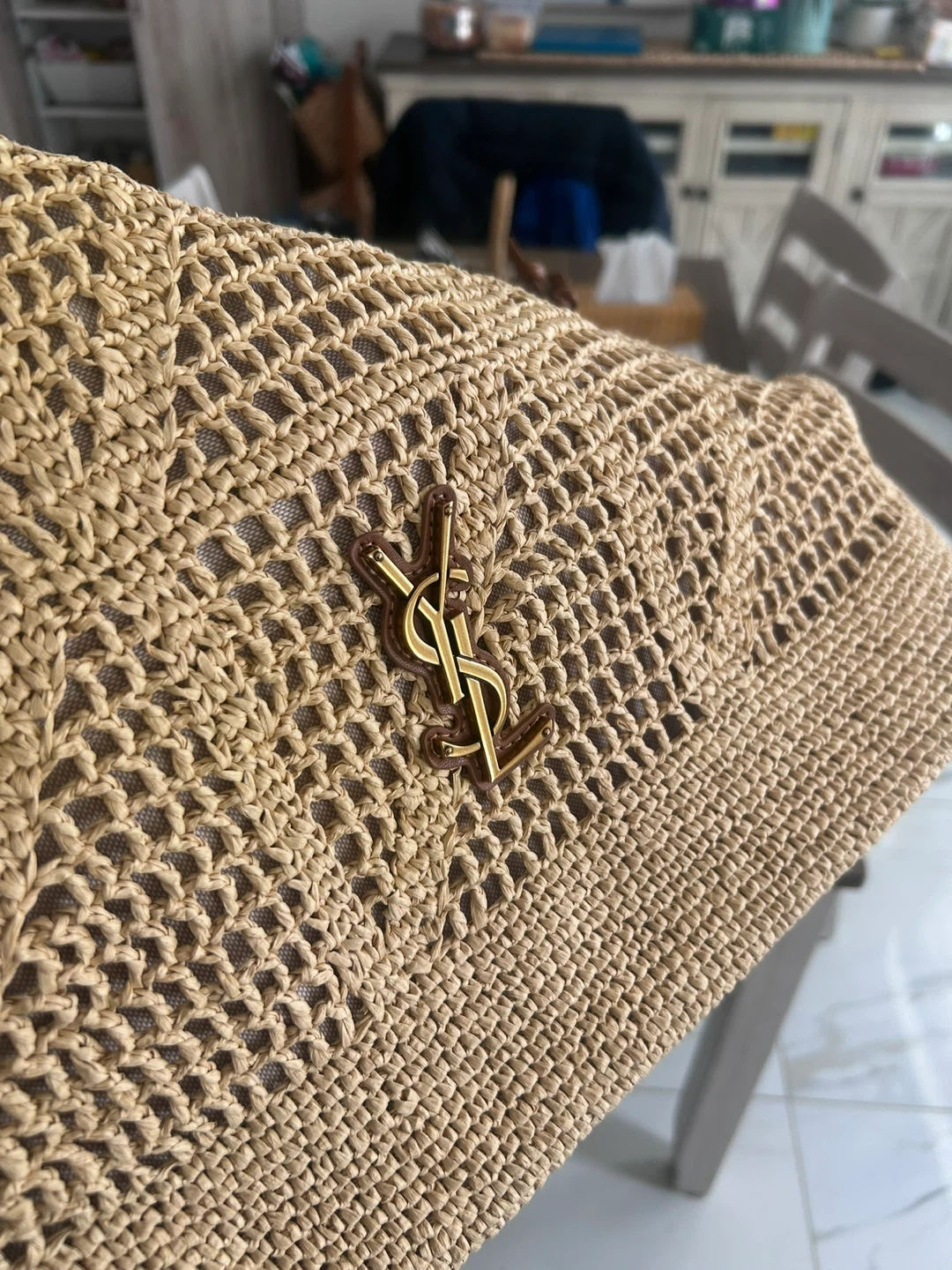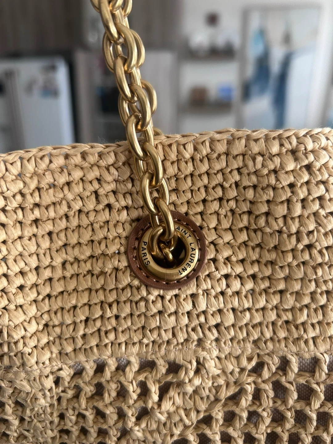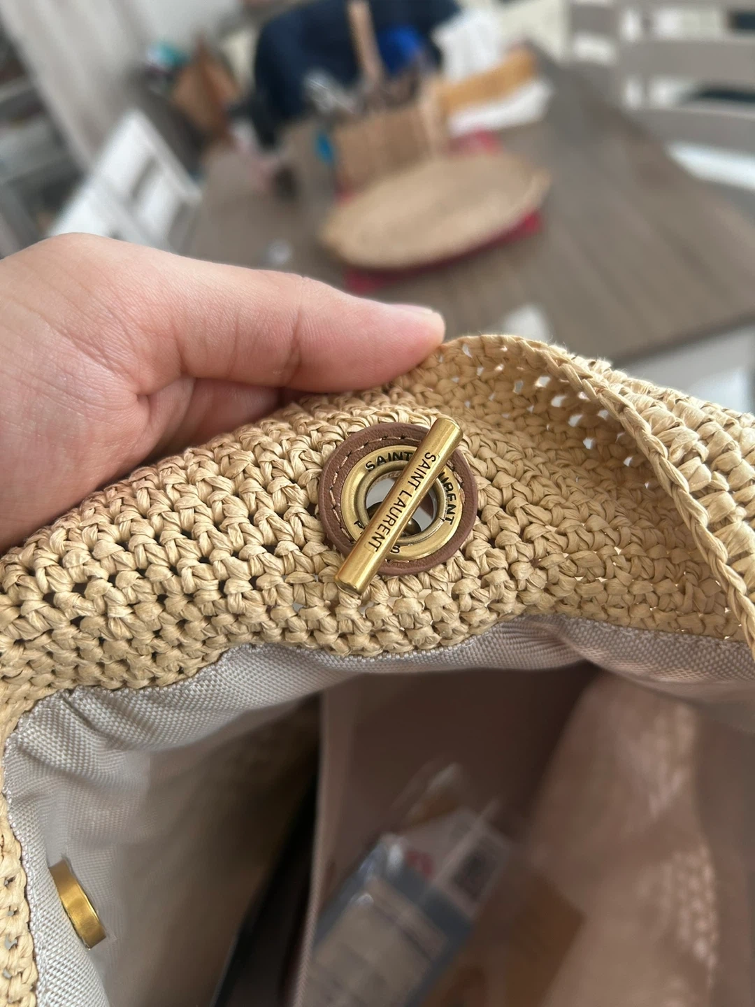This Saint Laurent tote bag is made from woven raffia with leather trim and gold-tone hardware. It features a secure closure and is perfect for everyday use.