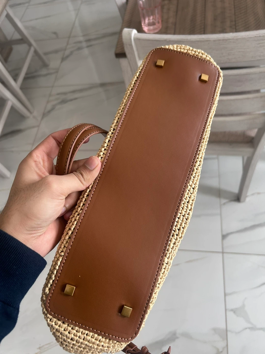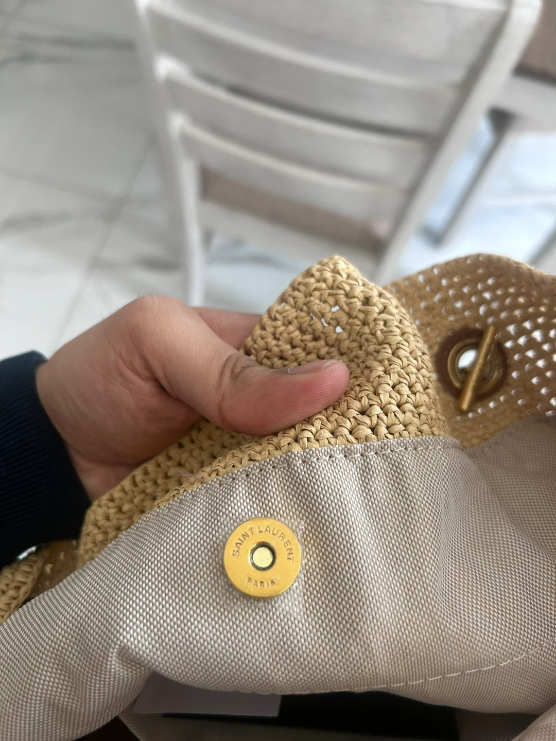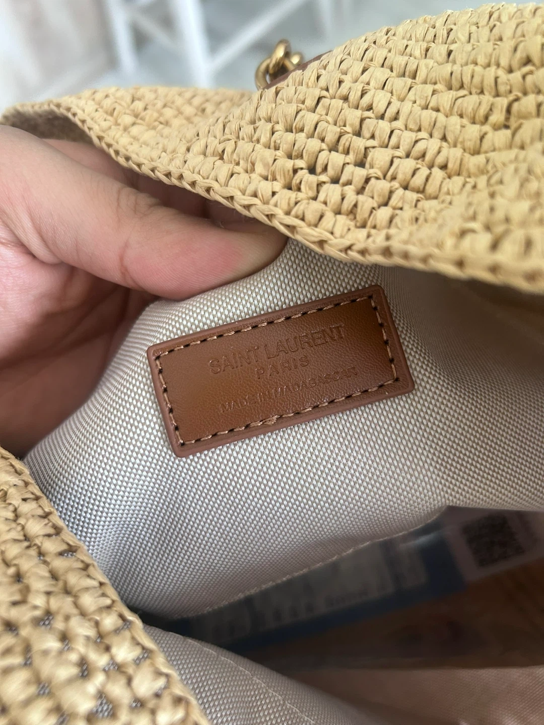 This Saint Laurent tote bag is made from woven raffia with leather trim and gold-tone hardware. It features a secure closure and is perfect for everyday use.