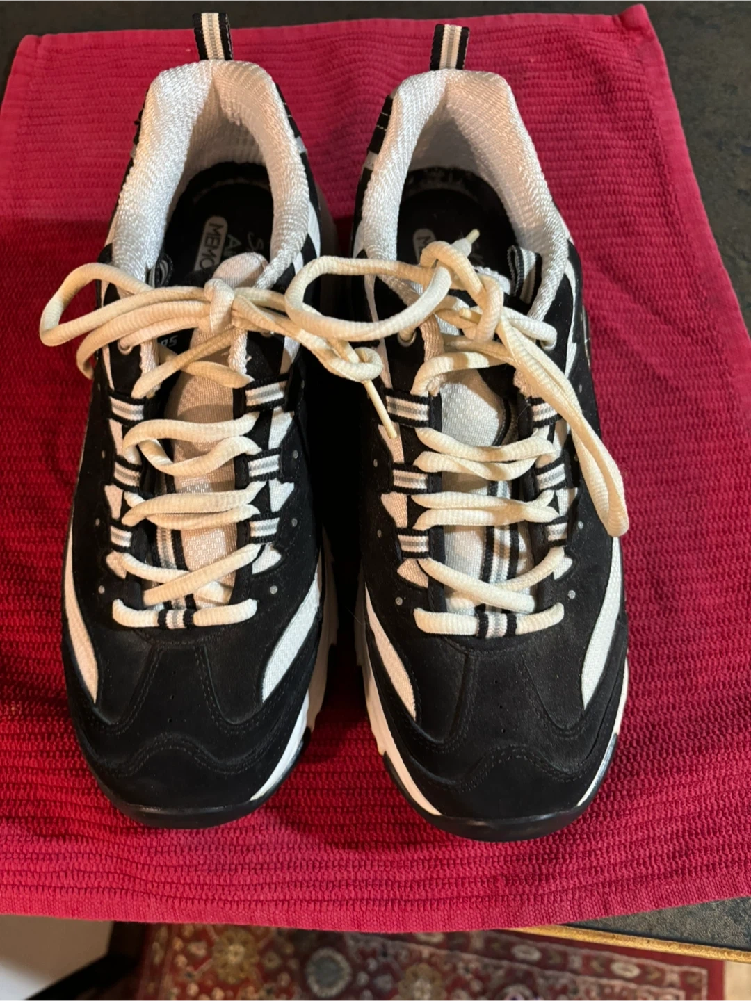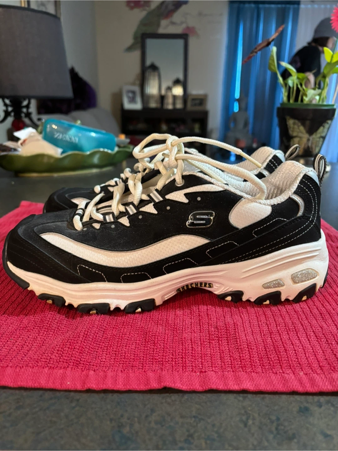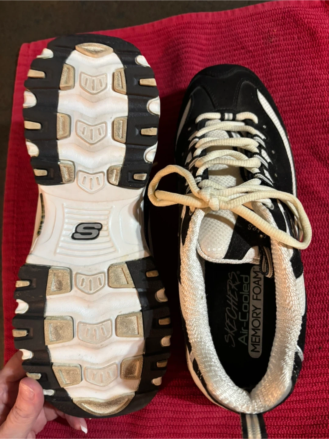 Selling a pair of Skechers sneakers in black and white. They feature air-cooled memory foam for extra comfort. Great for walking or everyday wear! They’ve only been worn once.