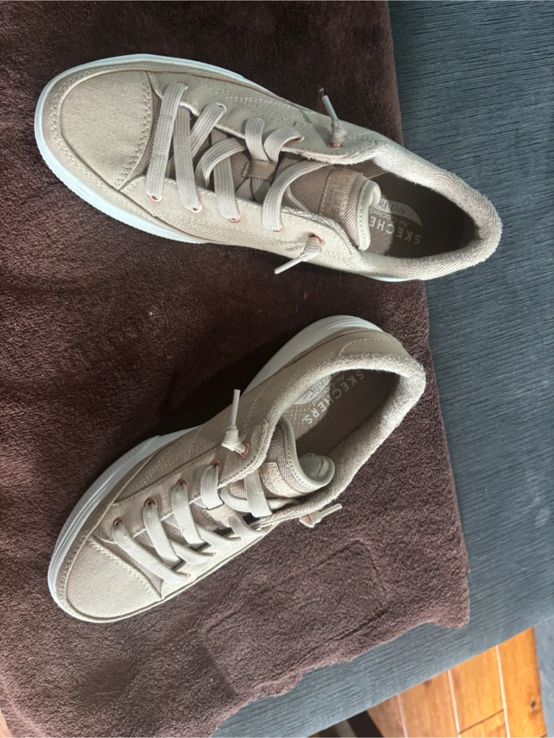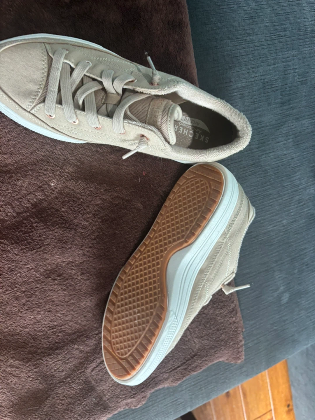 Selling a pair of Skechers Arch Fit slip-on sneakers in a lovely neutral colour! They are in great condition and super comfy for everyday wear. The size is US 9 . Perfect for running errands or just kicking around town!