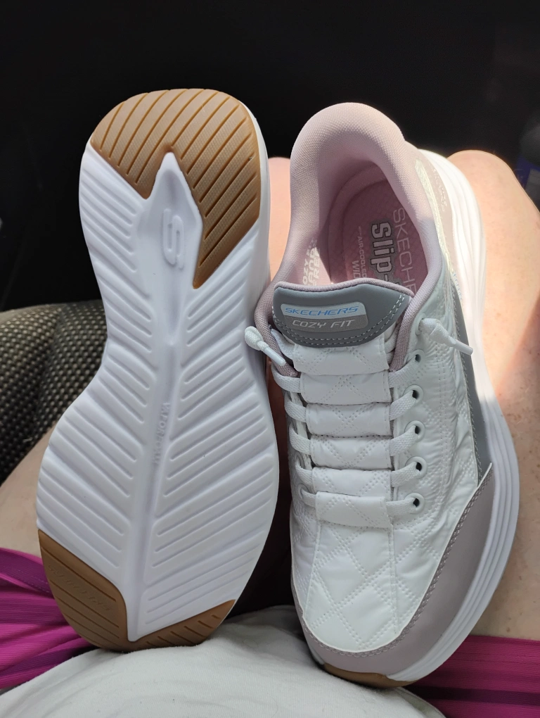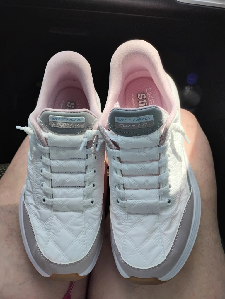 Selling a pair of Skechers Cozy Fit Slip-ins in a lovely white and pink colour combo! They are a women's size 7 US. Very comfy and in great condition! I only tried them on.