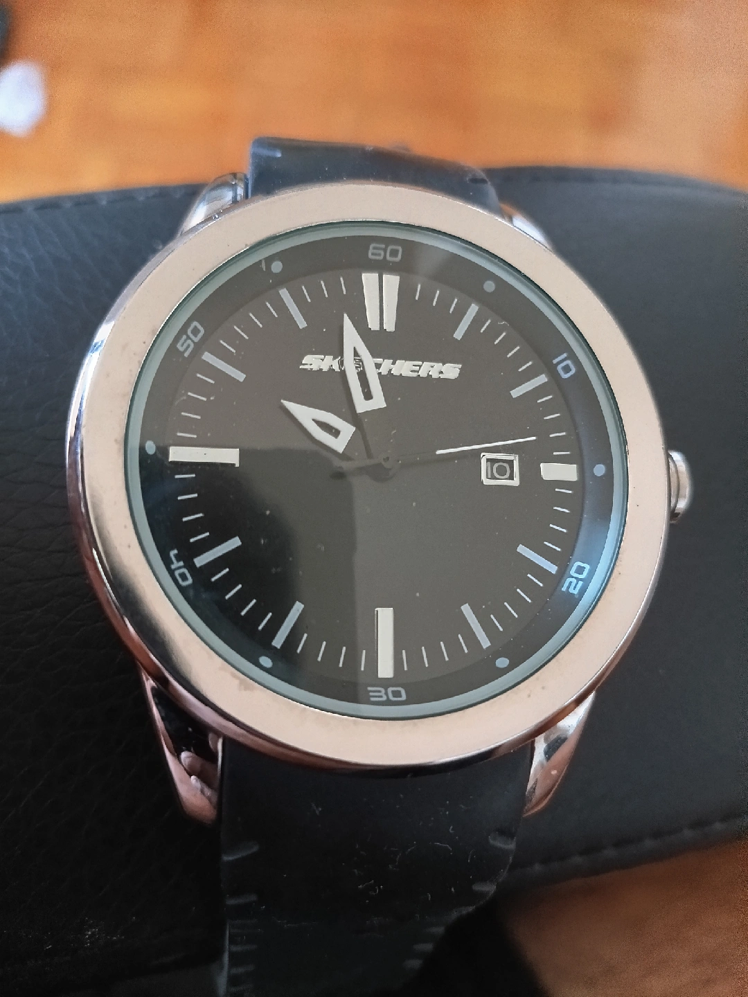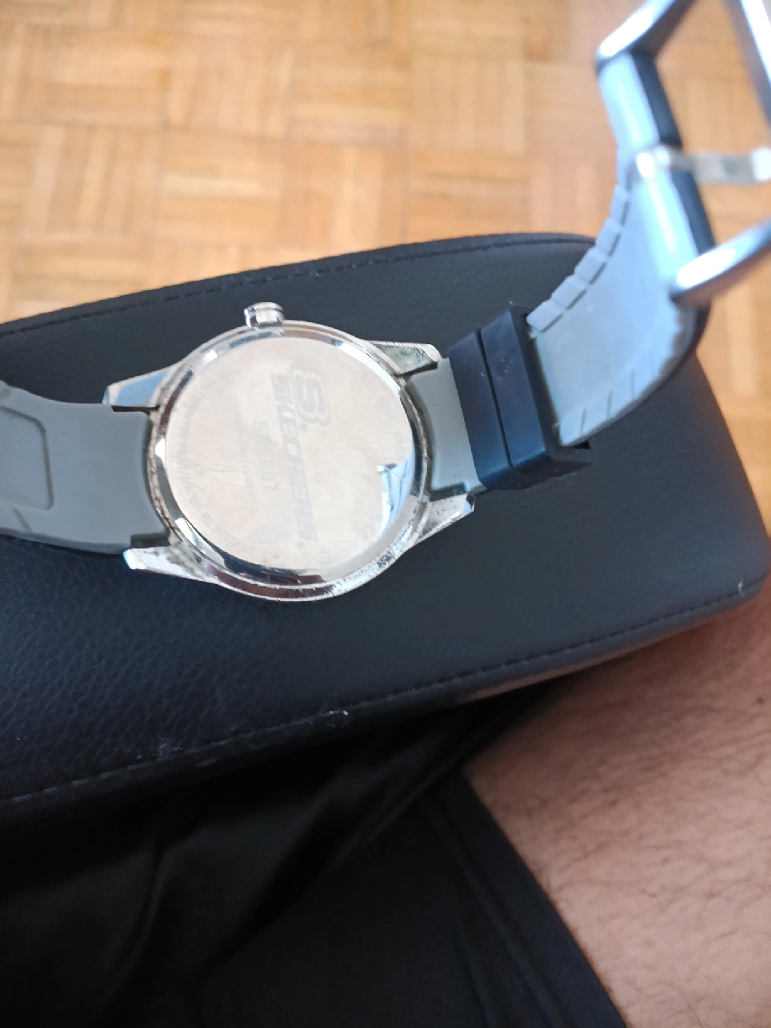 Selling a Skechers men's watch. It has a black face and a grey band. It is in good condition!
