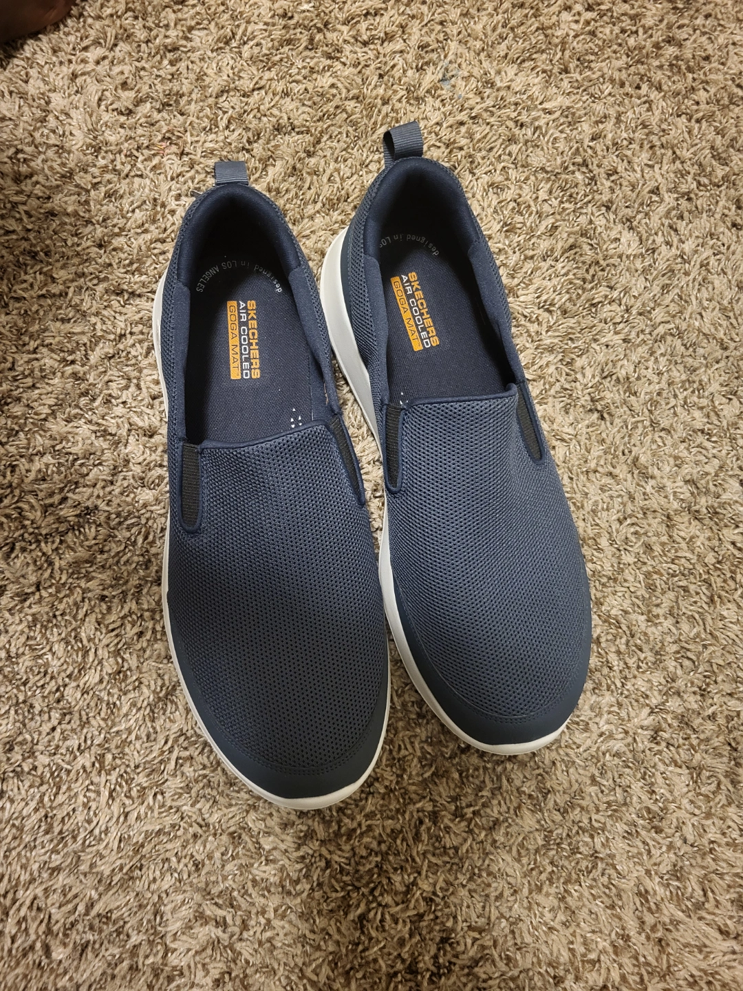 65Gently New Skechers slip-on sneakers. Navy blue colour. Air-cooled memory foam insoles. Comfortable and lightweight. Great for everyday wear.