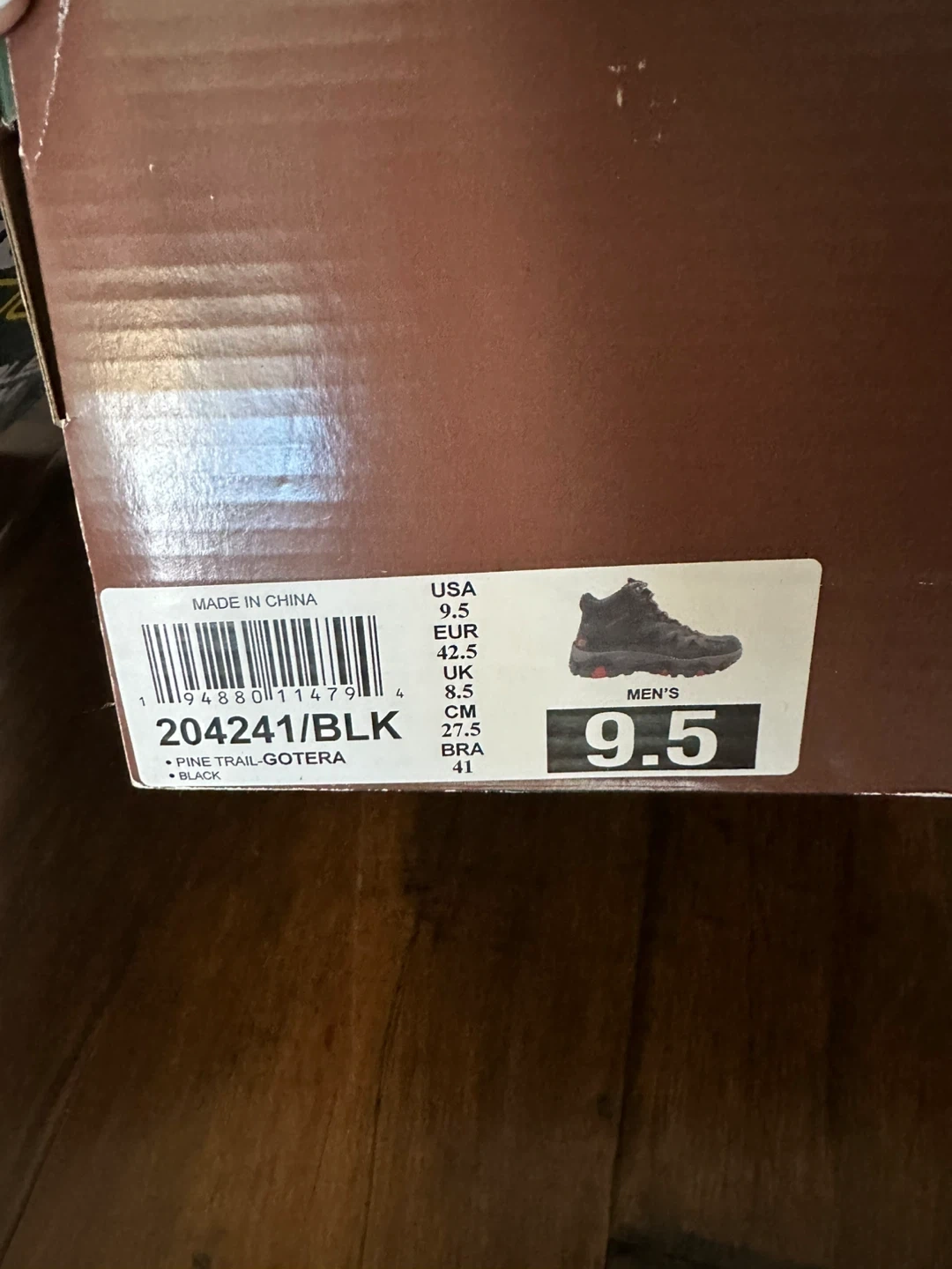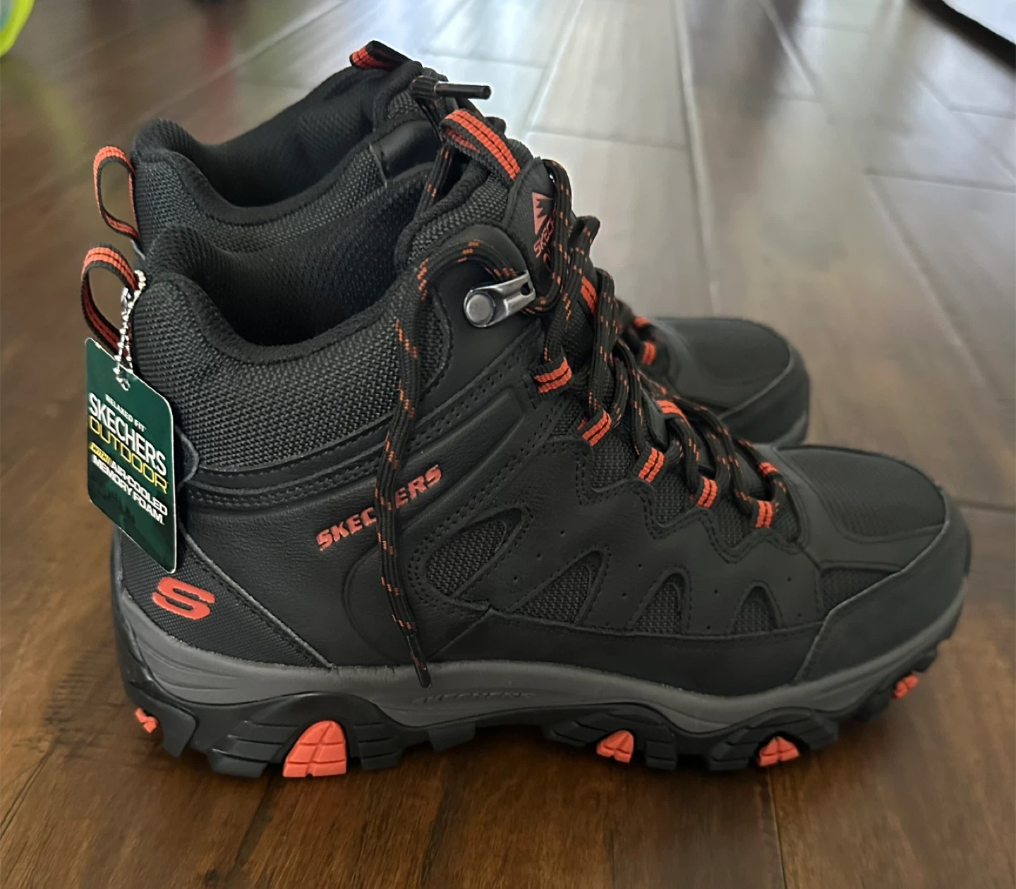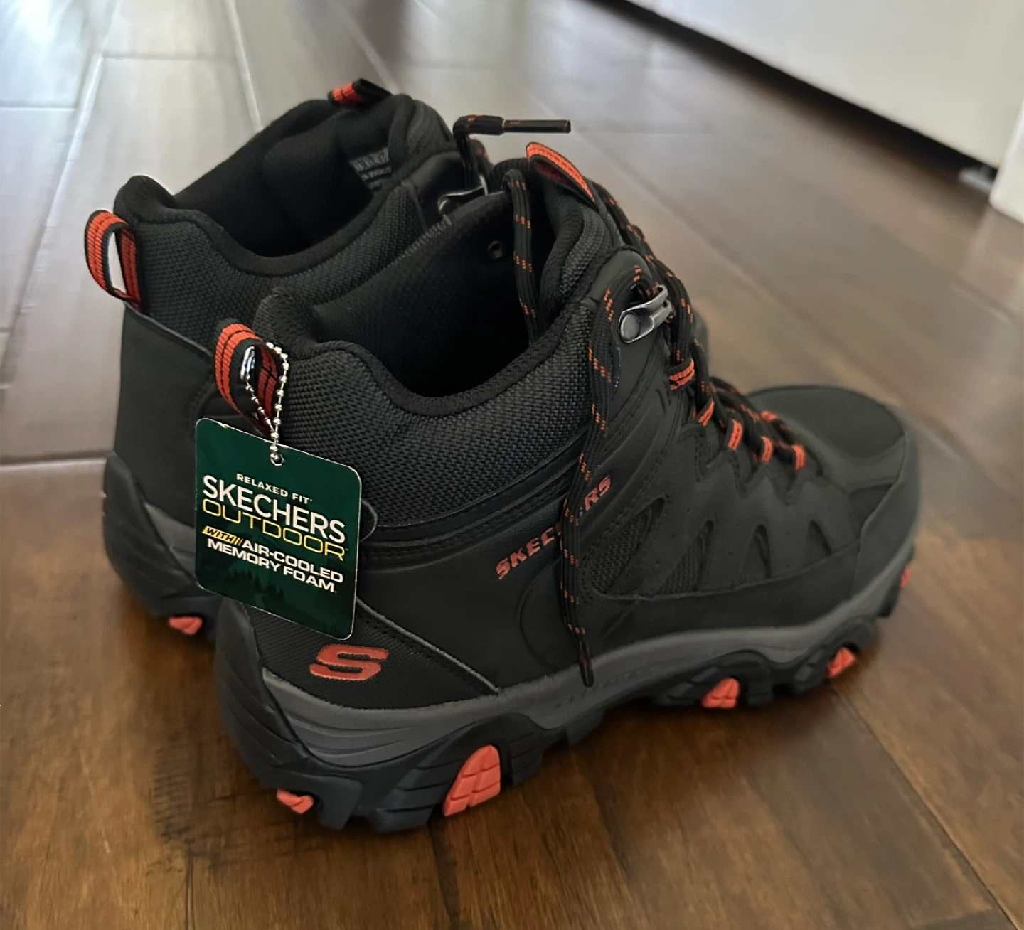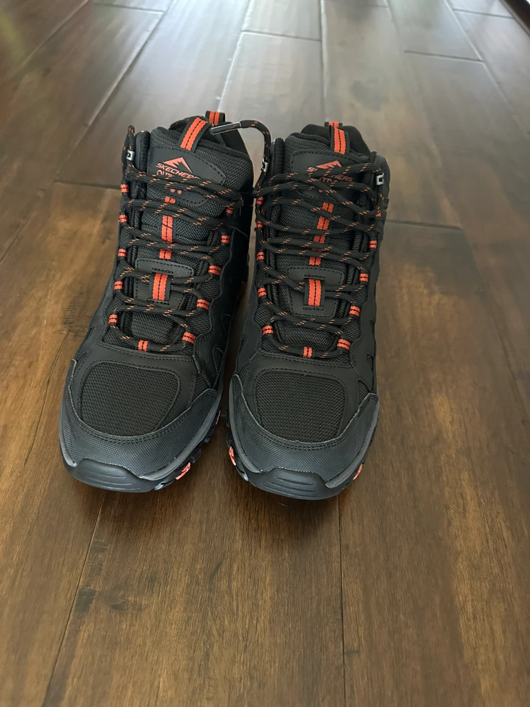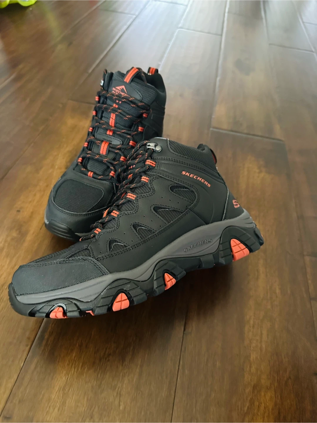 10Selling a pair of Skechers Outdoor hiking boots in great condition! They're a relaxed fit and feature air-cooled memory foam for extra comfort on the trails. - Brand: Skechers - Style: Hiking Boots - Size: US 9.5 - Colour: Black with orange accents