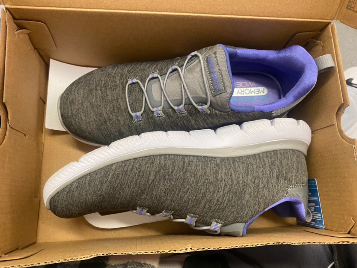 1000+Selling a pair of Skechers Summits-Quick Getaway women's shoes in size 7. They feature a memory foam insole for extra comfort and are even machine washable! These are grey with purple accents and come in the original box Had to use them for just an hour or two inside a acting classroom