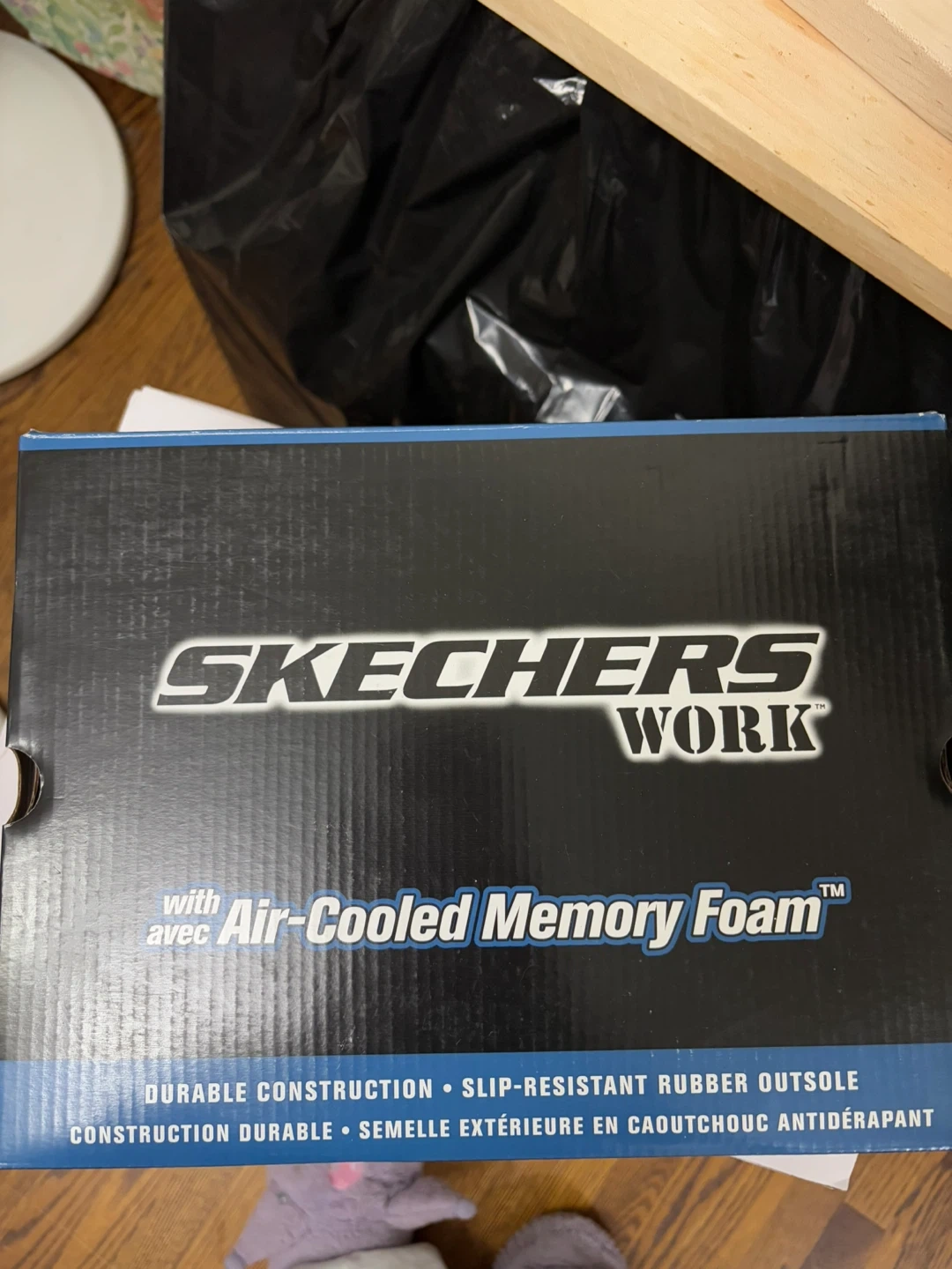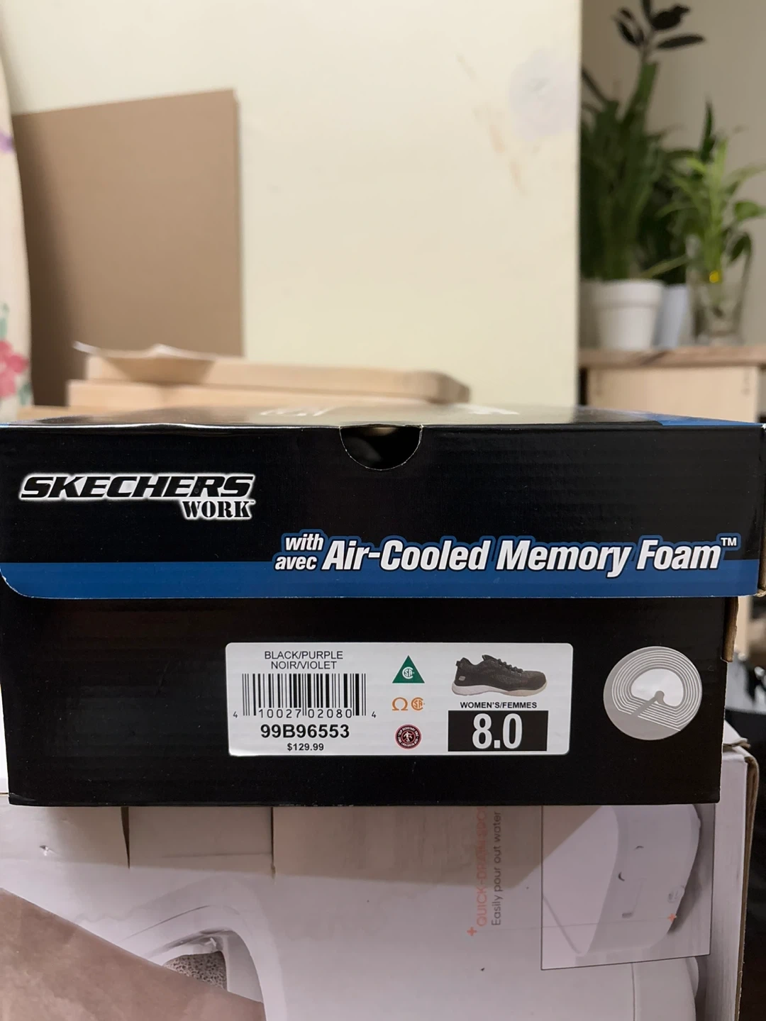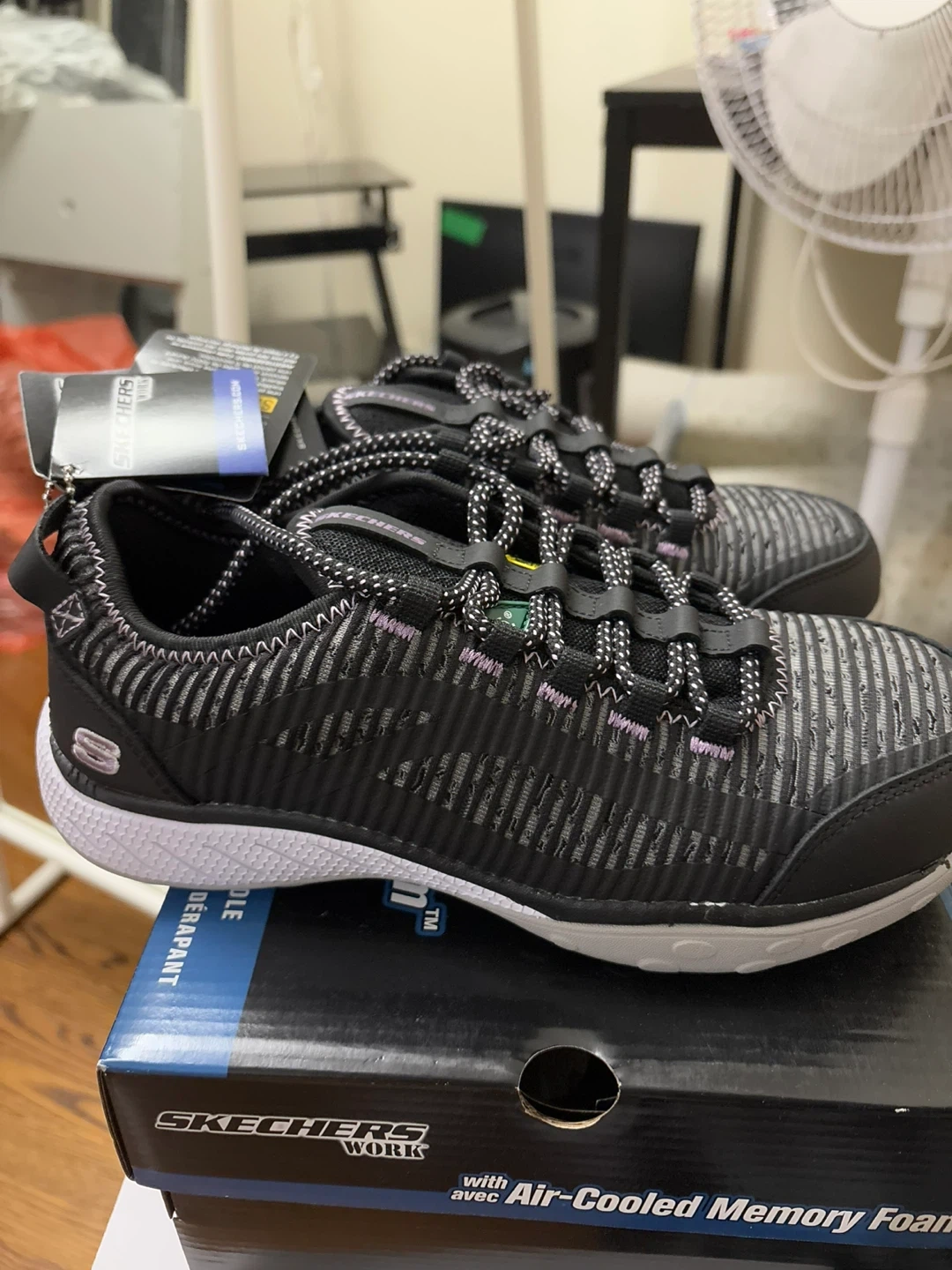 96Skechers Work shoes in black and purple, women's size 8. These have air-cooled memory foam for extra comfort and a slip-resistant rubber outsole. Durable construction. Originally bought for $129.99.