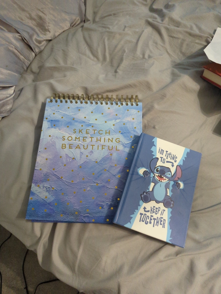 Selling a cute sketchbook with a blue watercolour design and a journal featuring Stitch. Both are in great condition!