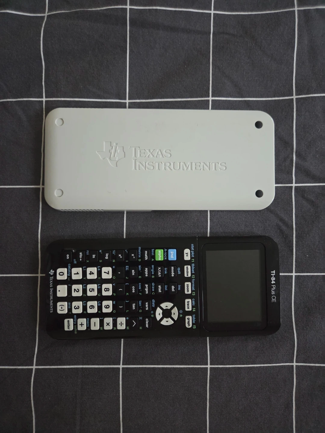 This is a Texas Instruments TI-84 Plus CE graphing calculator. It's black and white and comes with a protective slide cover.