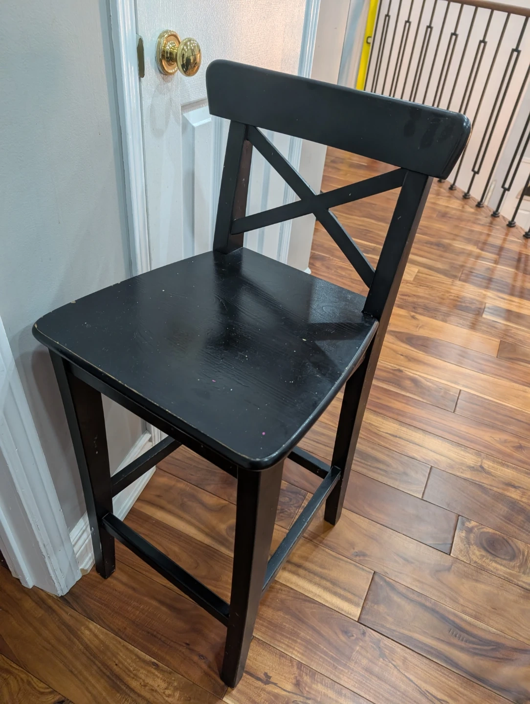 This is an IKEA ROSENTORP bar stool with a backrest in black. It's counter height. The seat height is 63 cm (24 3/4 "). This stool is great for a kitchen counter or bar area.