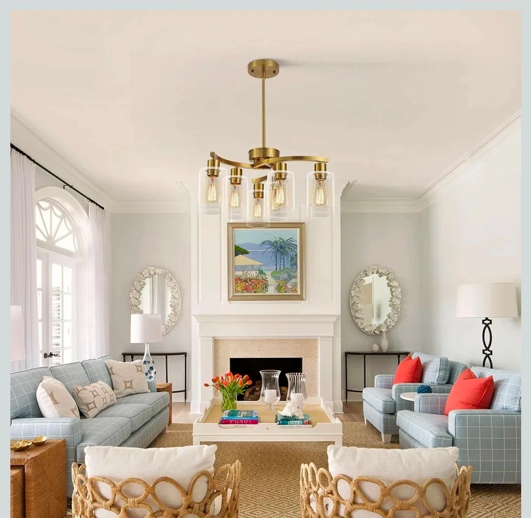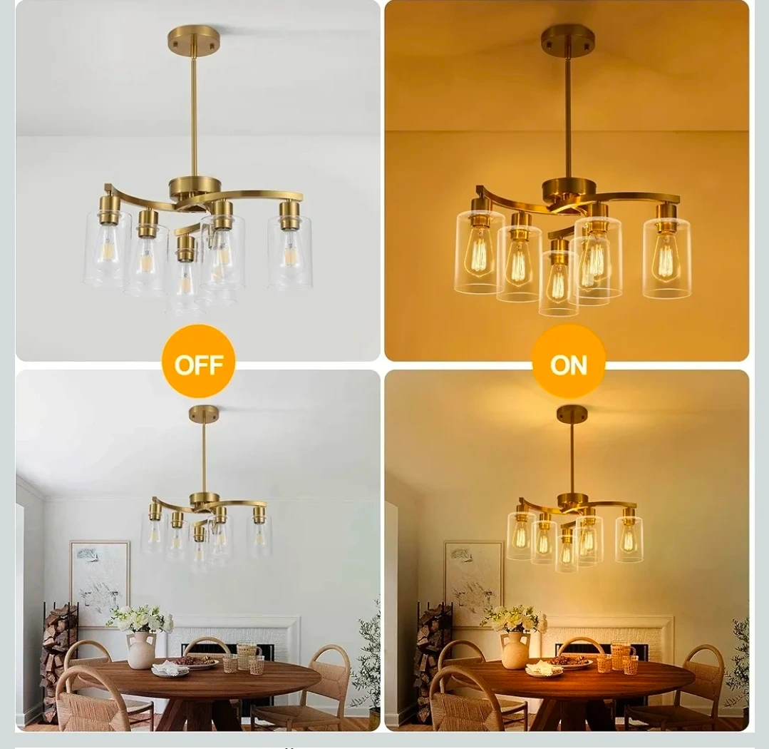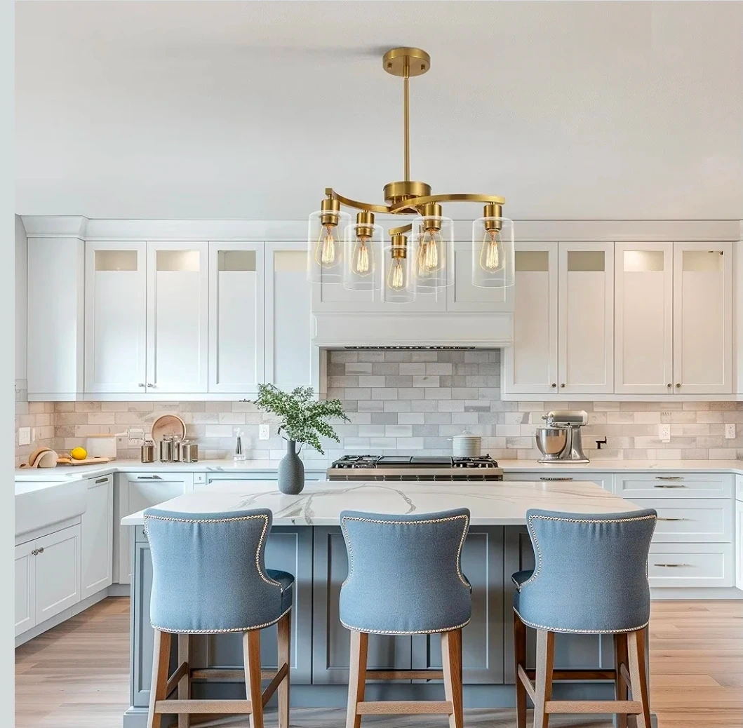 This 6-light gold chandelier features a modern design with clear glass shades. It's a stylish pendant lighting fixture. Great for adding a touch of elegance to any room!