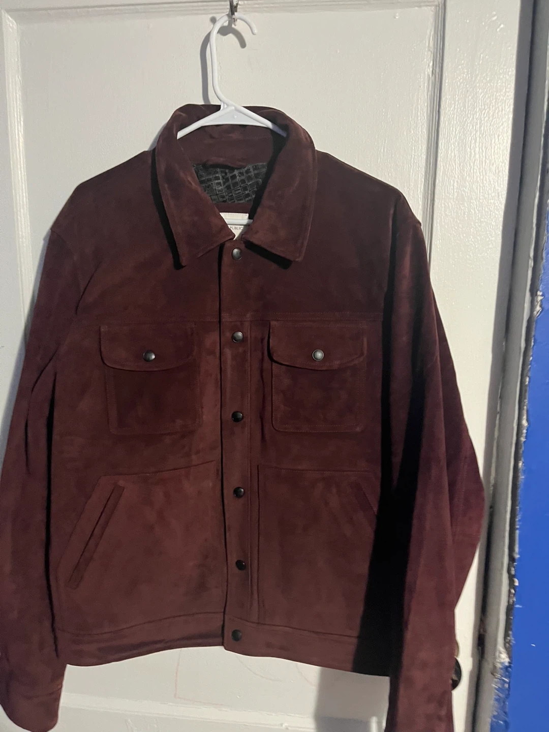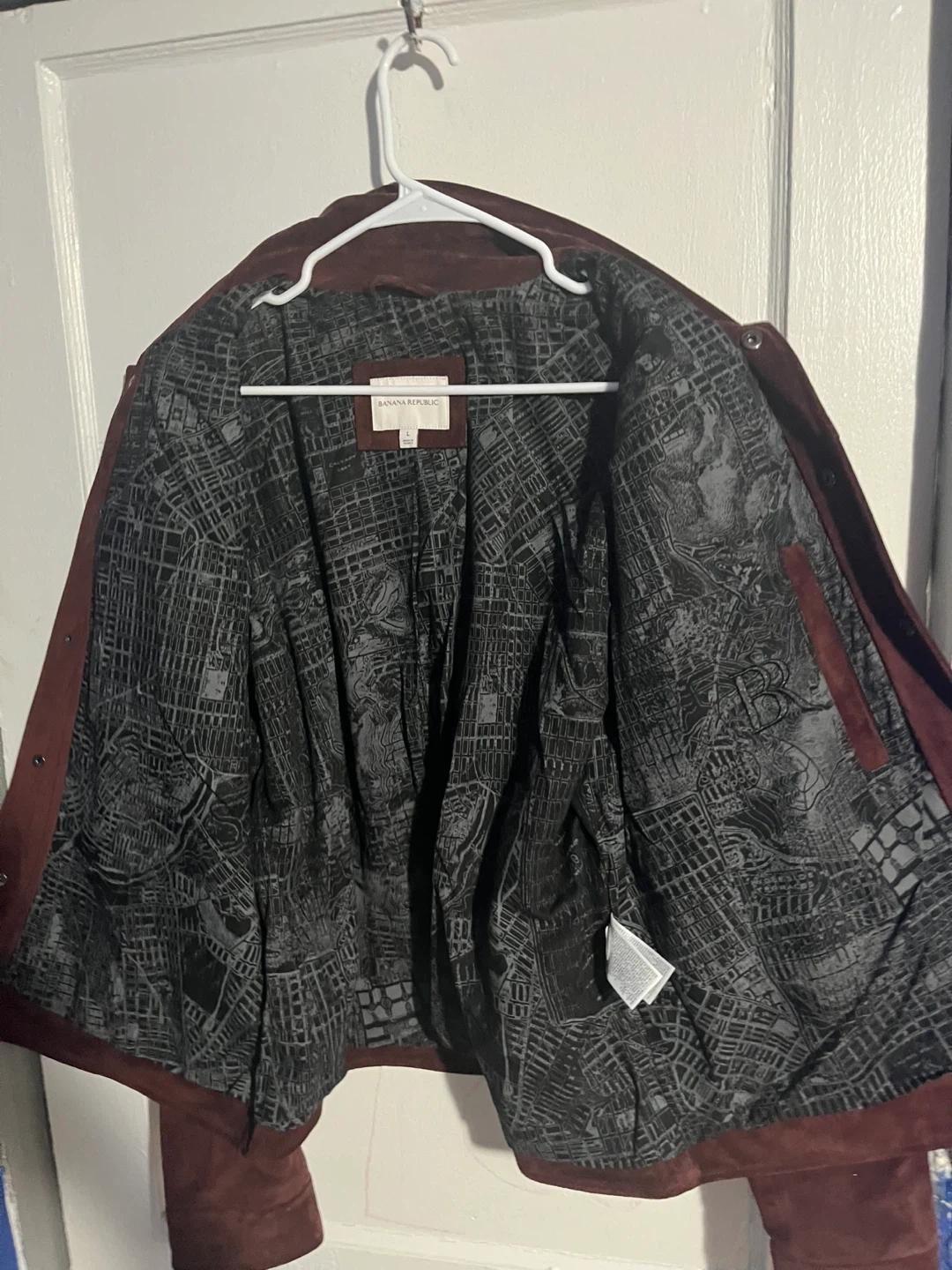 Buy & SellBanana Republic Suede Trucker JacketBanana Republic Suede Trucker Jacket$1This is a Banana Republic suede trucker jacket. It's a rich burgundy color with a unique map-print lining. Made from genuine suede.ConditionNewBrandBanana RepublicWHERE TO MEETCheck LocationView MapSELLERverifiedRgUniondale802 reviews0 chats·0 favorites·2 viewsSEND CHAT TO SELLERHi Rg! I’m interested in your listing.Hi Rg! I’m interested in your listing.Get the Karrot app to chatSign In to chat