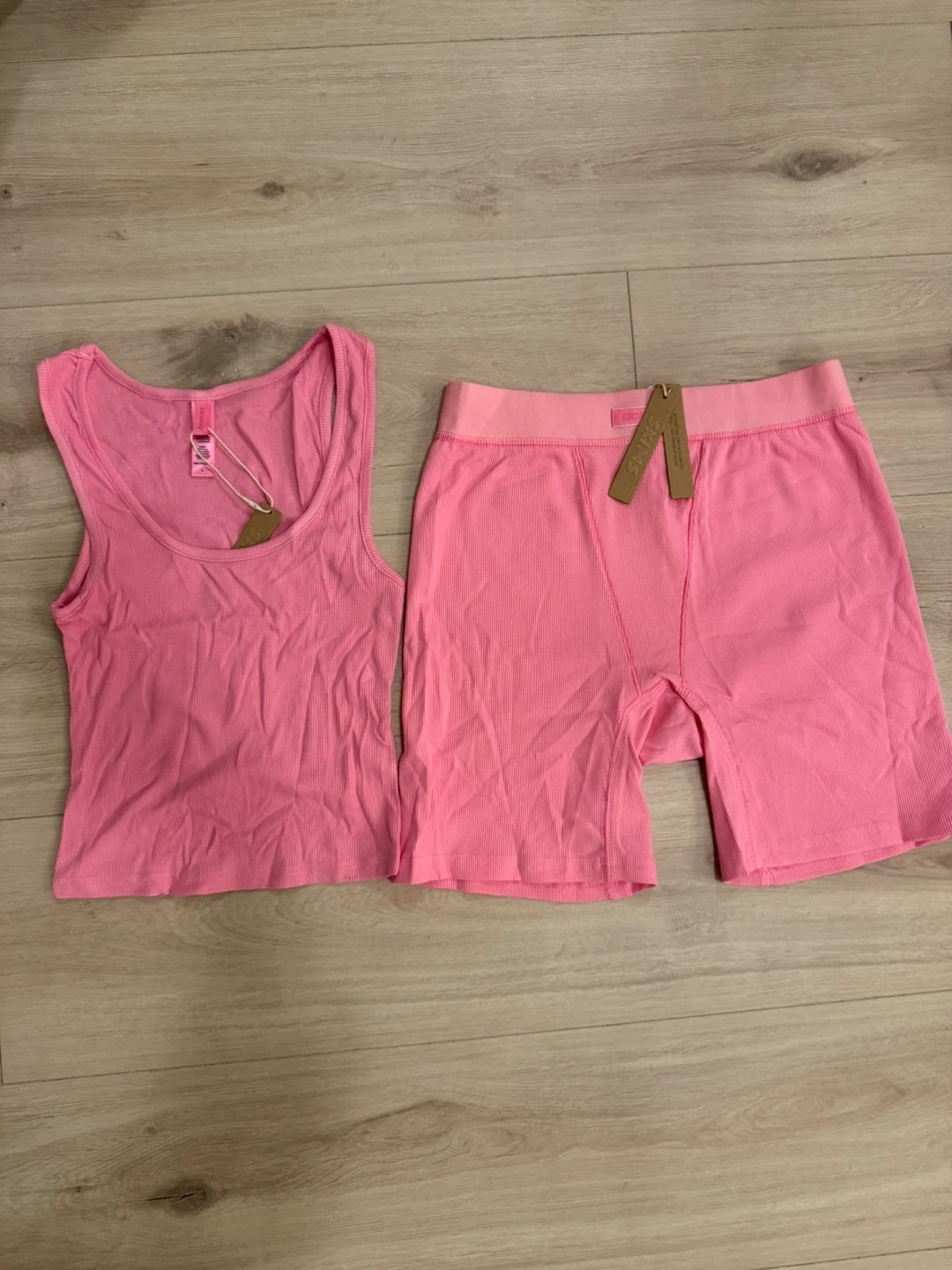 10Selling a brand new SKIMS rib tank and boxer set in pink Skims boxer + tank pj set w tags Size Large