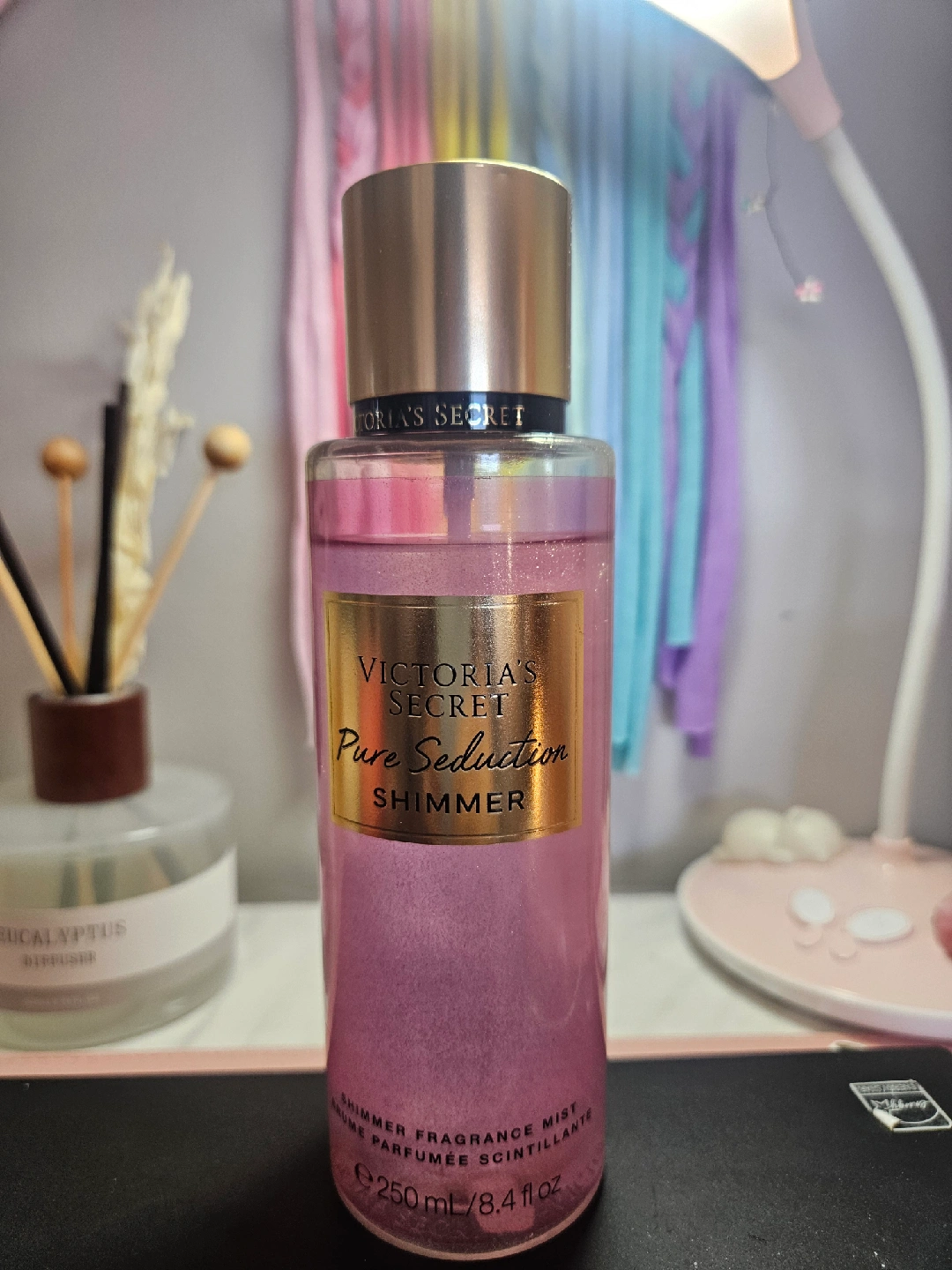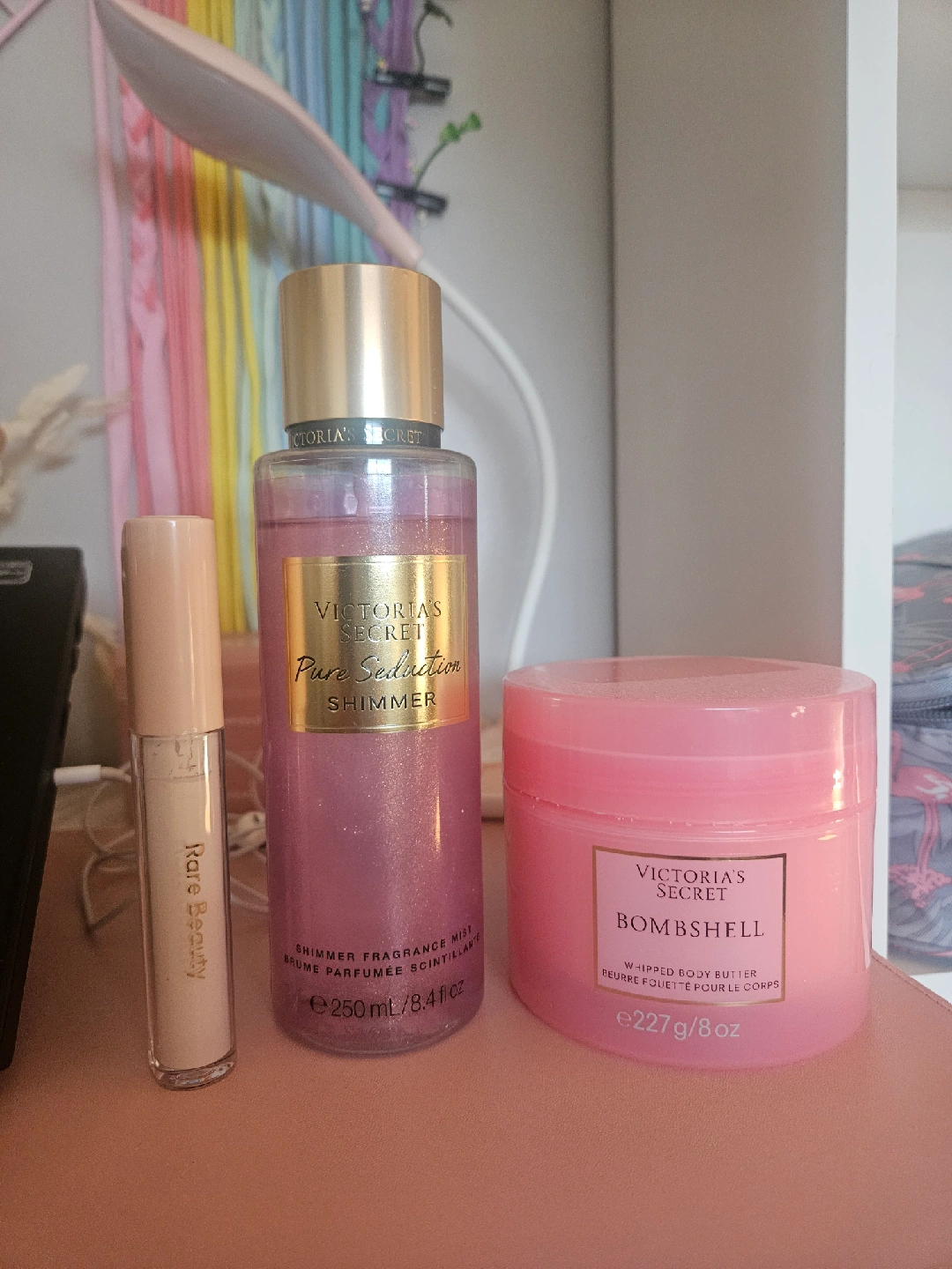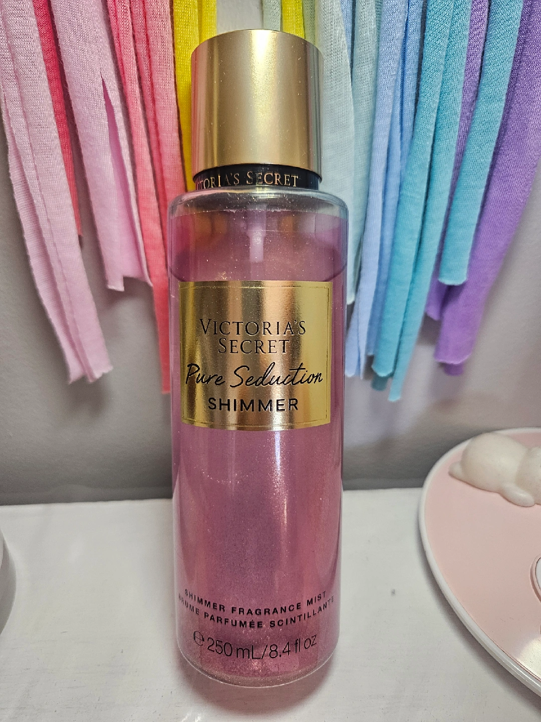 15Selling a Victoria's Secret Pure Seduction Shimmer fragrance mist (250 mL/8.4 fl oz), a Bombshell whipped body butter (e227g/8 oz) and a Positive light under eye brightener 4ml. Almost full, all for $20
